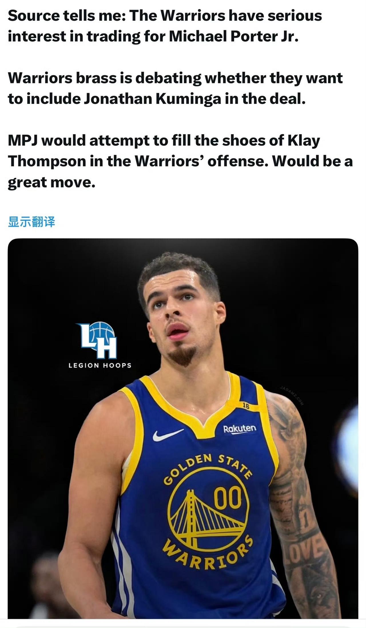 NBA交易流言汇总: 美媒The Athletic模拟了莫兰特去猛龙的三方交易,湖人送出了文森特和2032年次轮,得到灰熊后卫康查尔和猛龙侧翼阿巴基。[笑哭] 猛龙得到莫兰特,灰熊得到奎克利、沃尔特,文森特,2026年猛龙首轮签和2032年湖人次轮签。 美媒Legion Hoops消息: “勇士队对交易得到小迈克尔·波特抱有浓厚兴趣,管理层正在商讨是否将库明加纳入这笔交易之中。小波特能在勇士进攻体系中填补克莱汤普森留下的空缺,这会是一笔很棒的运作。”