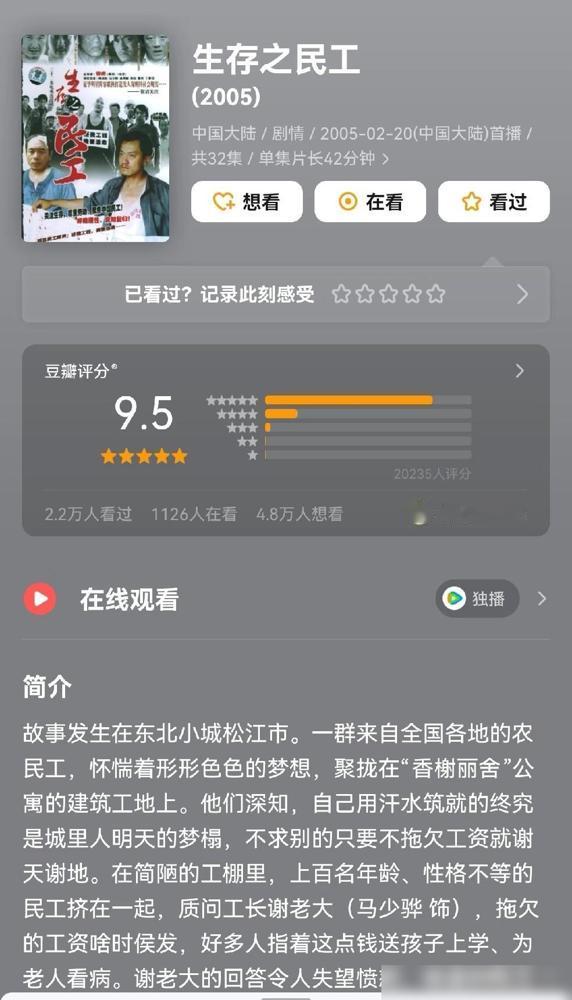 这个被采访者看向记者的眼神太绝了。这几秒钟的镜头,被采访的农民工疑惑于她的发问,试图确认她是否认真。 这是管虎20年前导的那部现实主义神作里的片段,当年深度刻画了农民工的生存状态,真实到像在看纪录片。 我总觉得以前的剧之所以有那种扎人的质感,是因为演员是真的沉进去了。 据说当时还没红的黄渤,被导演要求跟真正的民工同吃同住整整两个月,结果拍出来后,很多人甚至分不清谁才是职业演员。 这种真实感骗不了人,那种从期待到失望再到嫌弃的眼神转换,完全就是被生活“腌”透过之后才会有的应激反应。 虽然这部剧在2013年为了播出,改名叫《春天里》并删减了很多戏份,但那种阶层之间的巨大鸿沟还是藏不住。 我更在意的是那种“互不理解”,剧里把这种血淋淋的现实摆在面前,完全没打算用廉价的同情去粉饰太平。 管虎当时说的一句话挺戳人的,咱们脑子里预设的民工形象还是太肤浅了,当真正跟他们活在一起,才发现那根本不是一回事。 现在看这类剧确实会觉得压抑,大概是因为我们已经习惯了加厚滤镜的虚假,反而不敢直视这种不加修饰的尖锐真相了。