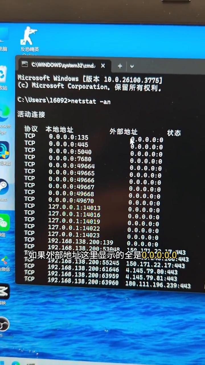 怎么判断公司的电脑有没有被监控? ·首先按WIN+R打开运行窗口,然后输入cmd,我这里已经输好了,点击确认。 ·在弹出来的窗口这一行输入netstat-an,大家一定要记得这中间这里是有一个空格的,输入完成以后按回车,等待它加载一会。 ·加载完成以后就是这个样子的,大家就去找这个状态这里是listening的选项。 ·然后再去看外部地址,如果外部地址这里显示的全是0.0:0:0.0,证明你的电脑没有被监控。但如果listening状态下你的外部地址出现了这些非0的选项,那你的电脑很有可能就被监控了。 上班摸鱼一定要小心!