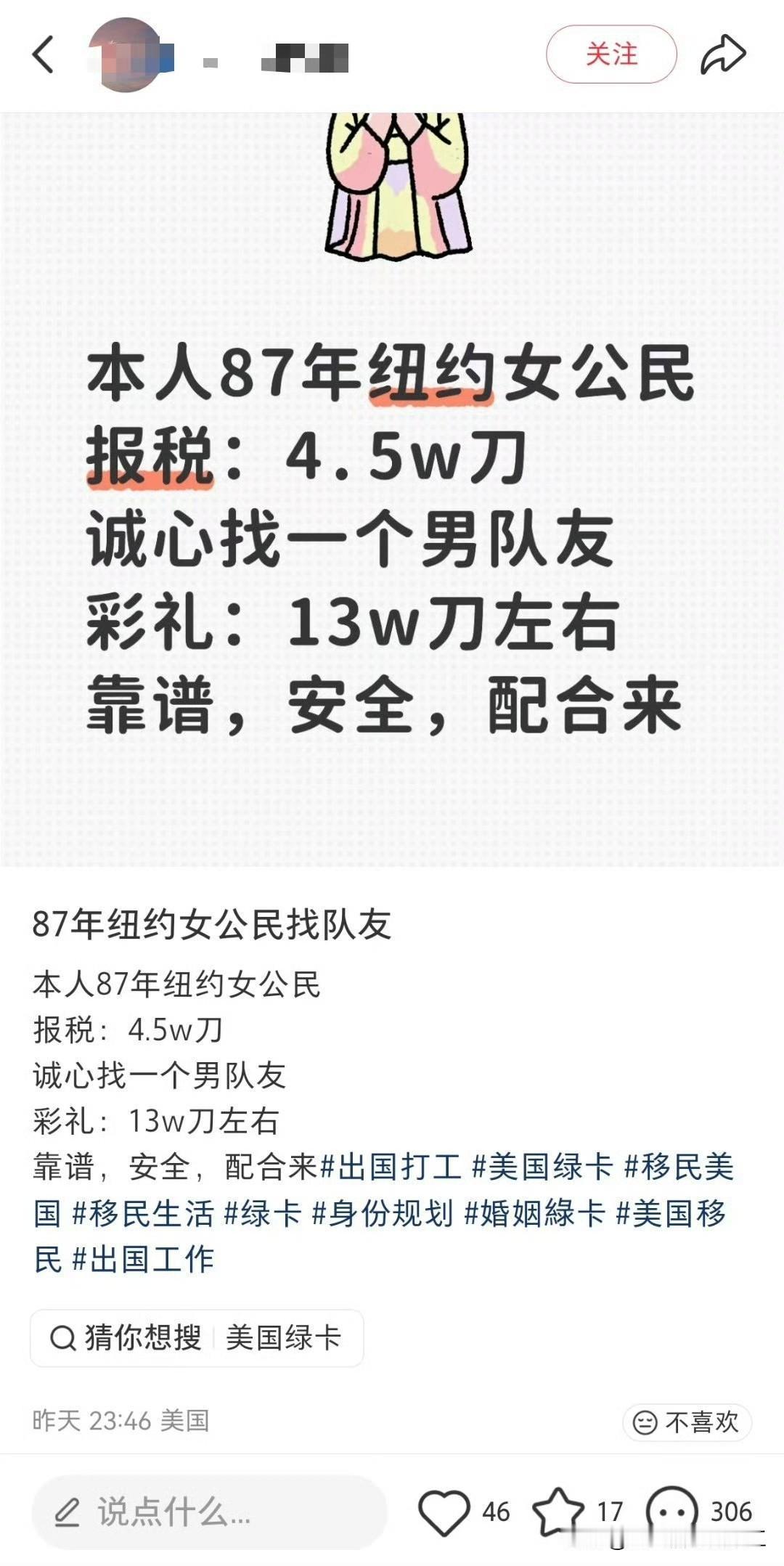 87年纽约女公民找队友 87年纽约女公民 报税:4.5w刀 诚心找一个男队友 彩礼:13w刀左右 靠谱,安全,配合来