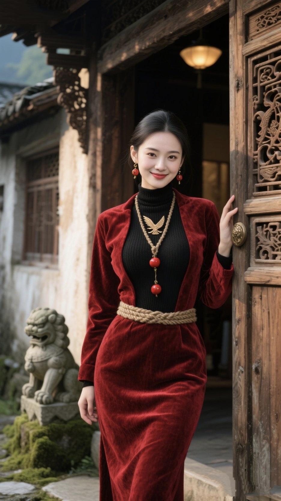 《红门》 她倚在半开的红门边 像一块被岁月捂热的琥珀 红丝绒裹着午后的光 麻绳腰带,系住了一院的春 老木门的雕花还醒着 青苔爬上了石狮的肩 她笑了一下 檐角的风,就软了 项链上的红坠子 是没说出口的故事 这一眼,是旧时光的扉页 轻轻一翻,就暖了流年 红门红门 红门庙 红门泰山 红门大吉 红门古韵 红门御花园 红门里