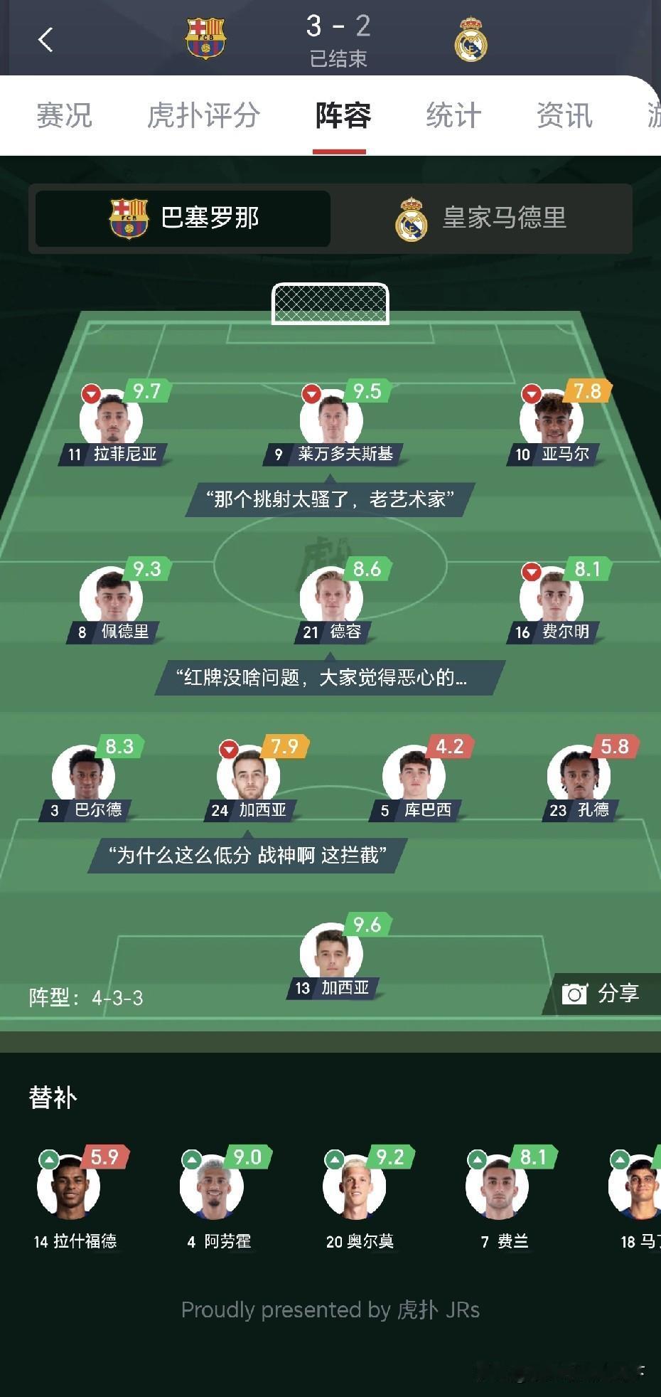 阿隆索怕是熬不到了过年了!皇马这场踢的完全毫无斗志,连安胖时期的搏命提速都打不出来,最后的绝杀球还在互相谦让,多次直面乔安的机会打得绵软无力。最后两个机会放以前早就绝杀了。难道这是还在药厂的债吗? 这场失利皇马的中后场要负全责。人家巴萨这几个后卫已经够送的了,姆总一上直接没进攻了,中场也空了,后防也开始漏了。 其实纵观整场比赛,皇马早像最后那样踢也不会输,边中结合。阿隆索也确实不适合这种豪门,可以说不知道踢得啥东西,在勒沃库森最可贵的配合是全部没有,这帮人压根就不听他的,说白了就是控不住更衣室。