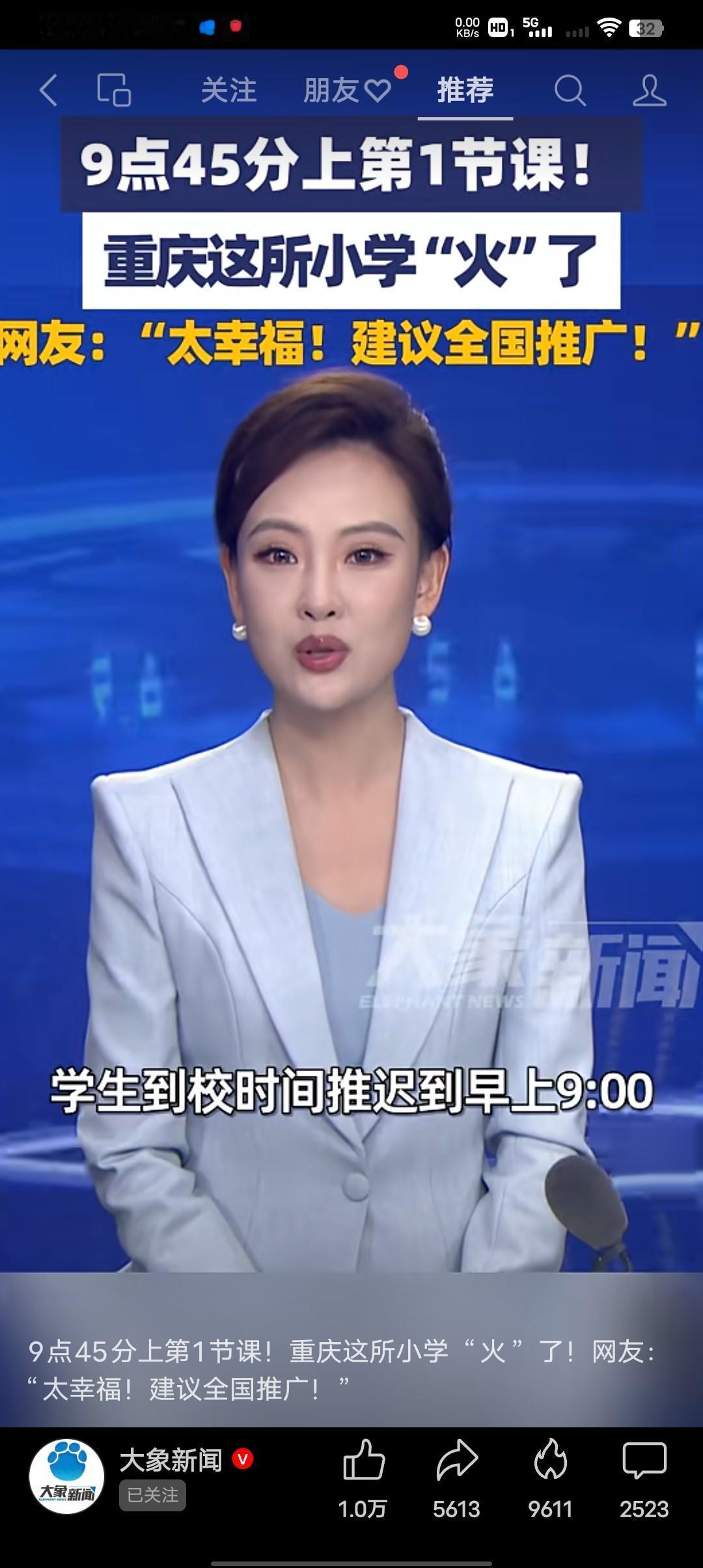 将学生到校时间延后到早上九点,你支持学校的这次改动吗? 近日重庆巴南鱼洞的这所小学“火”了,9:45分上第一节课,网友直呼太“幸福”了,家长纷纷留言表示支持。据了解鱼洞第二小学将一二年级学生的到校时间推迟到早上九点,第一节课延后到9:45分,充分保证了学生的睡眠时间。 学校老师表示,以前孩子睡眠不是很好,实行一年多以后效果很好,未来应该会一直实行。有早到需求的家庭,学校也会安排了教室自习,网友表示应该全国推广。 有网友在下面评论,应该是早睡早起,对身体才是好的,这不是本末倒置吗?关键是谁去送孩子呀?家长总不能等到八点以后再去上班吧!古代的时候都是晚上早睡,晨读是少不了很关键的,还有人说,直接不让孩子读书不就省了吗? 你觉得这次学校推迟学生到校时间,值得推广吗?对学生有好处吗?说实话,我不敢沟通学校这样的改动,我觉得正确的方式,应该是晚上督促学生早睡,不应该然后学生的到校时间!