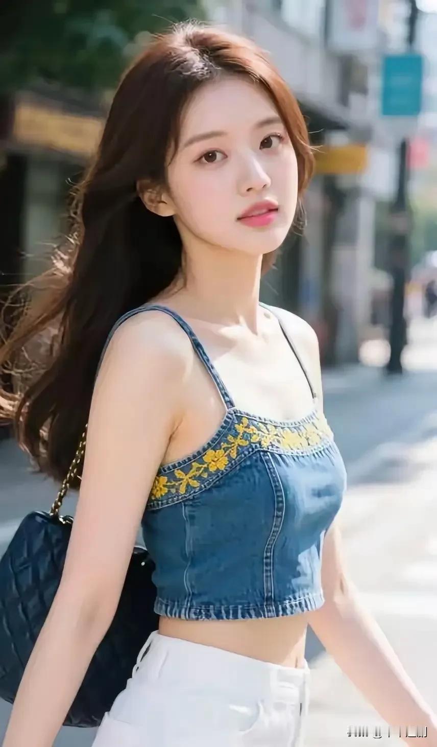 牛仔刺绣吊带搭白色下装,街头暖阳背景揉出清新又元气的夏日氛围感🌿 牛仔吊带裤搭配 简约吊带裙穿搭