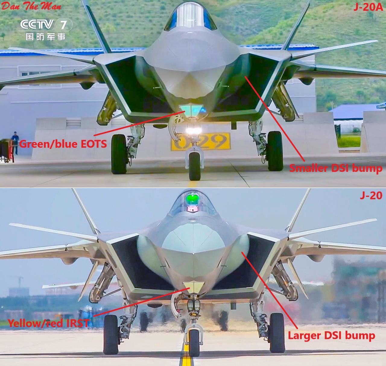 歼20A和歼20正面对比区分,如果座舱盖不打开,加上光线作用,实际还是很难区分。 图源X外国网友
