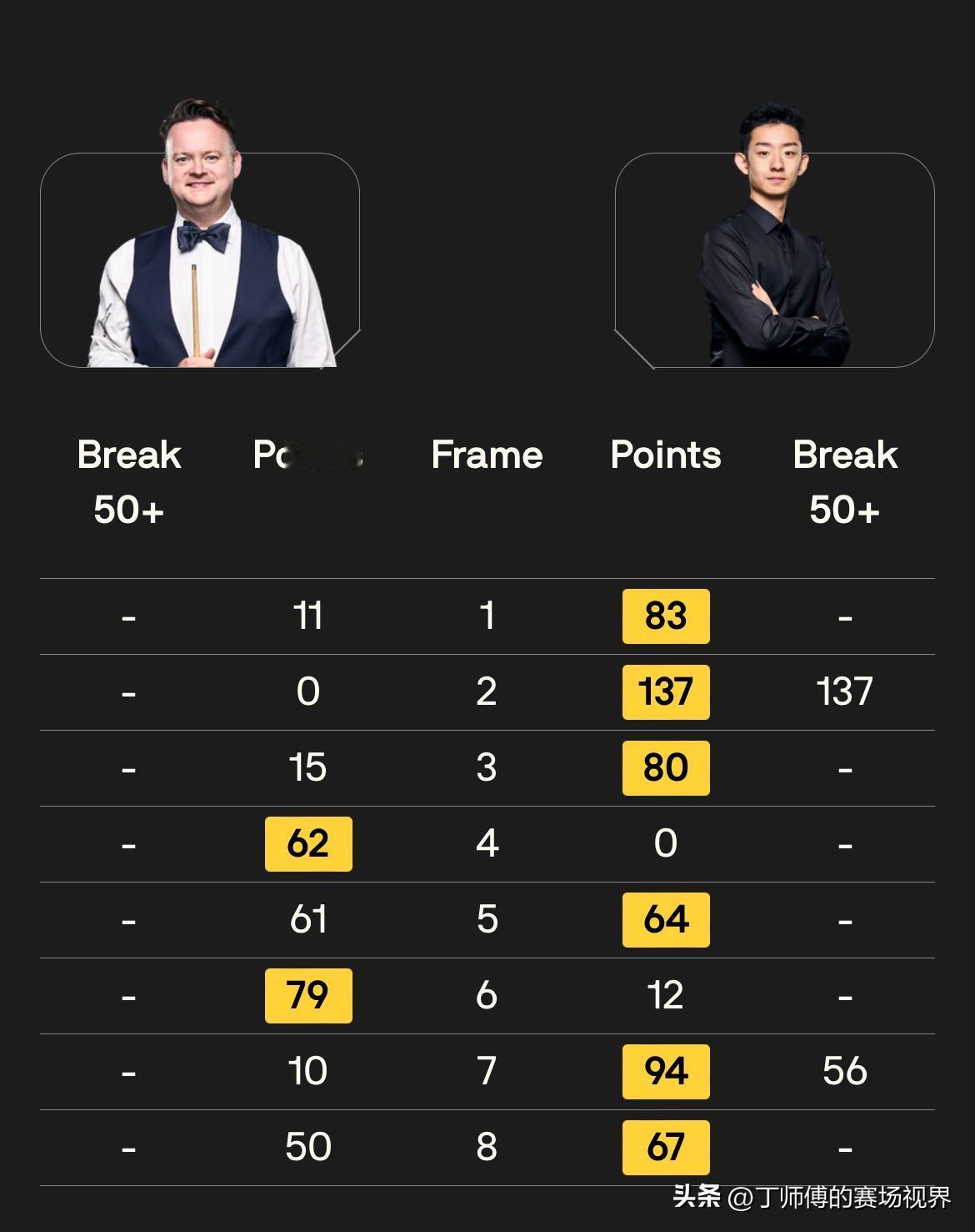 吴宜泽击败墨菲赛后采访:“入场走下台阶的那一刻,正是我儿时梦想的舞台。说实话,我当时感到非常自豪,我甚至有点不知所措。很明显肖恩今天打得很差,我感觉自己打出了一些精彩的进球,但也出现了一些严重的失误。在关键时刻,我认为心态上的稳定在一定程度上给了我一些优势,最终帮助我赢得了比赛。我会继续练习,保持状态,等待下一场比赛,不会给自己太大的压力。” 职业生涯首次亮相大师赛的吴宜泽在首轮以6-2爆冷终结了卫冕冠军墨菲,将在1/4决赛和肖国栋上演中国德比,后者同样以6-2淘汰了塞尔比,这样一来也确保了半决赛至少有一位中国球手。