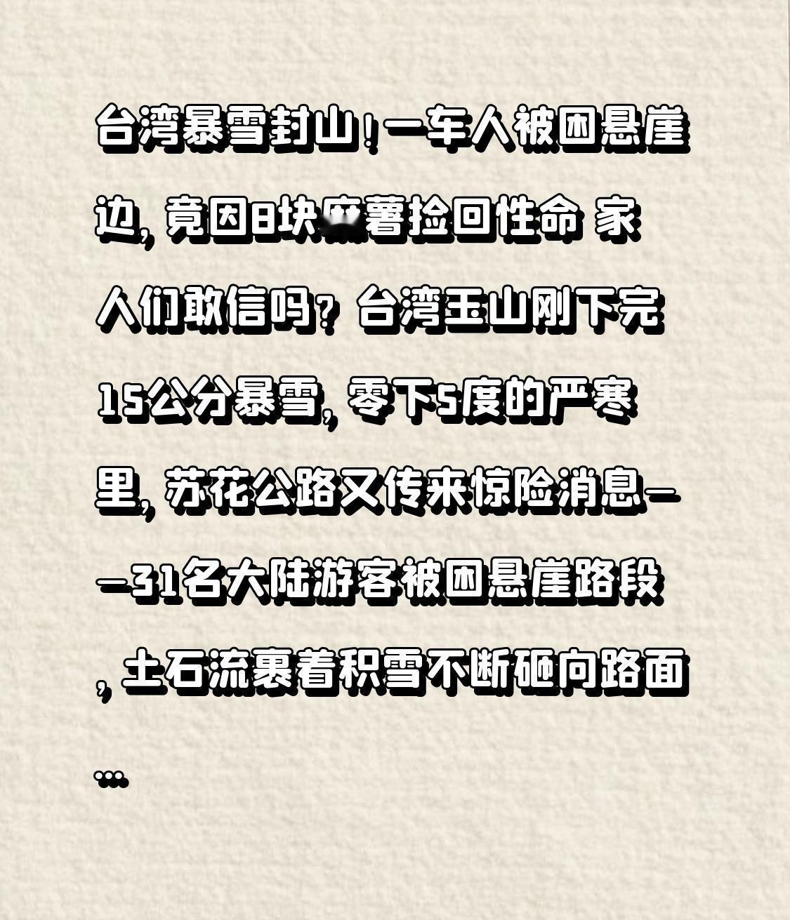 台湾暴雪封山!一车人被困悬崖边,竟因8块麻薯捡回性命 家人们敢信吗?台湾玉山刚下完15公分暴雪,零下5度的严寒里,苏花公路又传来惊险消息——31名大陆游客被困悬崖路段,土石流裹着积雪不断砸向路面,可谁能想到,拯救他们的不是救援直升机,竟是导游随手买的8块麻薯! 事情发生在暴雪最猛烈的当天中午,云南导游张燕带着游客行驶在苏花公路114公里处,突然狂风卷着积雪和落石砸向车窗,前方路面瞬间被泥石流吞没。司机当机立断把车停在植被完整的避险区,可这一停就是24小时。窗外是万丈深渊,车内温度降到零下,游客们的焦虑跟着寒意一起蔓延,有人想冒险下车探路,被张燕死死拦住:“外面一步就是绝境,等救援才是唯一出路!” 就在大家又冷又饿时,奇迹般的转折出现了。台湾本地导游黄静芝突然想起,上公路前耽误了8分钟买手工麻薯,没想到这8分钟,竟让他们避开了最危险的塌方路段。更暖心的是,被困游客们自发分享仅有的物资:云南导游的维生素胶囊、阿里山买的白瓜子,甚至有人拿出超辣小米辣抗寒,瓜子壳都舍不得丢,大家挤在车里相互取暖,陌生的两岸同胞此刻成了生死与共的家人。 最让人泪目的是救援现场。台湾消防队员背着30公斤物资,在结冰路面上爬行前进,有人被落石砸伤截肢,还笑着说“就当是上天的考验”;军方直升机优先转运老人,年轻游客主动徒步撤离,为救援减轻负担。当69岁的魏启才老人喝到台湾乡亲递来的热汤时,红着眼眶说:“这碗热汤,比什么都暖。” 其实暴雪无情人有情,不管是大陆游客还是台湾乡亲,在灾难面前,我们都是一家人。那些在风雪中伸出的援手,那些不分彼此的分享,都是刻在血脉里的温情。愿暴雪早日停歇,愿每一次出行都平安顺遂,也愿这份跨越海峡的情谊,像冬日暖阳一样,温暖每一个人。 如果你被这份真情打动,别忘了点赞转发,让更多人看到这份两岸同心的力量!