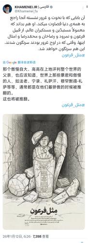 伊朗最高领袖哈梅内伊今天(北京时间1月12日)写道:“那个趾高气扬、自以为了不起地评判整个世界的家伙,应该明白像法老、尼罗德、礼萨汗、穆罕默德·礼萨以及其他那些暴君,在其极度狂妄之时都被推翻了。这个人也会如此。”   随文发布的图片更具冲击力,一尊破损的特朗普雕像置身埃及古墓之中。   哈梅内伊提及的几位暴君,每一位都对应着清晰的历史隐喻,绝非随意罗列。   法老代表着古埃及的专制王权,曾盛极一时却终究被历史洪流吞没,象征着强权再鼎盛也逃不过兴衰定律。   尼罗德作为古巴比伦的暴君,以暴虐统治和扩张著称,最终落得身死国灭的下场,暗指穷兵黩武的必然结局。   而礼萨汗与穆罕默德·礼萨父子,更是伊朗人心中难以磨灭的记忆。   礼萨汗建立巴列维王朝,虽推行过司法、行政改革,试图建立现代国家,却也靠着高压统治巩固集权,关闭独立报社、流放异见者,用审查制度严控思想,最终因倒行逆施失去民心。   其子穆罕默德·礼萨继位后,延续亲美独裁统治,漠视民众诉求,最终在伊斯兰革命中被推翻。   哈梅内伊特意点出这对父子,既是唤醒伊朗民众对独裁统治的警惕,也是暗指美国的霸权行径与当年的巴列维王朝如出一辙,终将引发反抗。   那张破损特朗普雕像的图片,更是隐喻拉满,埃及古墓本就是逝去王权的象征,将特朗普雕像置于其中,等于宣告其霸权如同古墓中的遗迹,早已注定走向衰败。   雕像的破损状态,既代表着伊朗对美国霸权的不屑,也暗示着这种强权在多方抵制下已显露裂痕。   这种用图像传递立场的方式,比直白谴责更有力量,也更能引发国际社会对历史轮回的思考。   哈梅内伊此时发声,是近期美伊关系持续紧张的必然反应,此前美国就多次加码对伊制裁,试图从经济、军事上遏制伊朗发展,还联合以色列在中东地区针对伊朗势力频频发难。   就在几天前,哈梅内伊还曾指责美国和以色列策划伊朗国内动乱,怒斥特朗普双手沾满伊朗人的鲜血,如今再用历史暴君警示,无疑是对美国近期一系列动作的强硬回应。   这种回应方式,尽显伊朗的战略智慧,伊朗深知自身与美国在军事实力上存在差距,不会贸然进行正面军事对抗,而是选择用历史叙事和舆论反击占据主动。   哈梅内伊作为伊朗的精神领袖,其言论能凝聚国内共识,唤醒民众的反抗意识,同时向国际社会传递伊朗抵抗强权的决心,让美国的霸权行径陷入道德和舆论困境。   美国的霸权逻辑,其实与哈梅内伊提及的暴君如出一辙,动辄对他国指手画脚、干涉内政,靠军事力量和经济制裁推行自身意志,自以为能掌控全球格局,却忽视了各国人民对独立自主的追求。   就像当年的礼萨汗父子,即便靠着高压统治维持一时稳定,最终还是被民众的反抗浪潮推翻,美国如今的狂妄行径,也正在不断消耗自身的国际信誉,积累更多反抗力量。   伊朗的抵抗从未停歇。面对美国的制裁,伊朗一边稳固国内经济,拓展与其他国家的合作,打破封锁;一边强化自身国防力量,让美国不敢轻易动武。   哈梅内伊的言论,既是对美国的警告,也是对国内民众的鼓舞,让大家明白强权终会衰败,坚持抵抗就能迎来转机。   那张古墓中的破损雕像,更像是对全球格局的一种隐喻,当今世界早已不是单一强权说了算的时代,多极力量正在崛起,各国越来越重视主权平等和自主发展,美国试图延续霸权的做法,就像古墓中的遗迹,终究会被历史淘汰。   哈梅内伊用历史警示强权,不仅是为伊朗发声,也是为所有被压迫国家传递信念,狂妄自大的暴君终将覆灭,正义与平等才是时代的主流。   这场舆论交锋的背后,是强权与反强权的持续博弈,伊朗用历史为武器,对抗美国的霸权施压,既展现了自身的底气,也让国际社会看清了霸权的本质。   历史的轮回从未停止,那些妄图掌控世界的狂妄之徒,终究会重蹈前人的覆辙。   参考资料:北京日报客户端《哈梅内伊喊话特朗普》