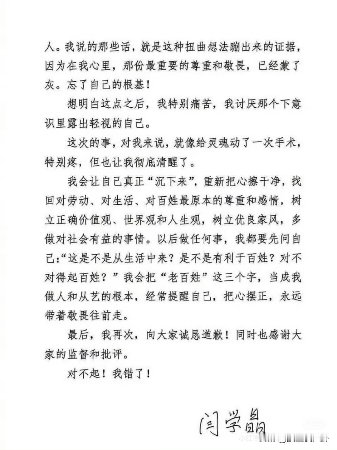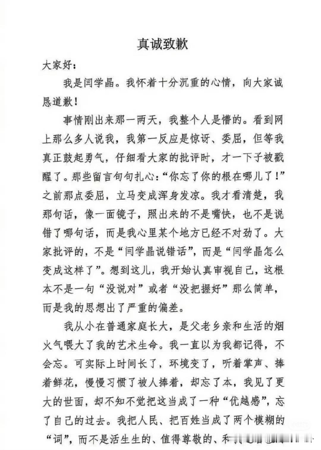 没有人为打工人牛马发声吗? 闫学晶这个道歉声明一看就是打工人给她写好的,她最多就在上面签了一个大名吧! 要是她真能写出“我把人民,把百姓当成了两个模糊的词,而不是活生生的值得尊敬的,和我根连着根的人”这样的句子,她就不会说酸黄瓜那样的词了。