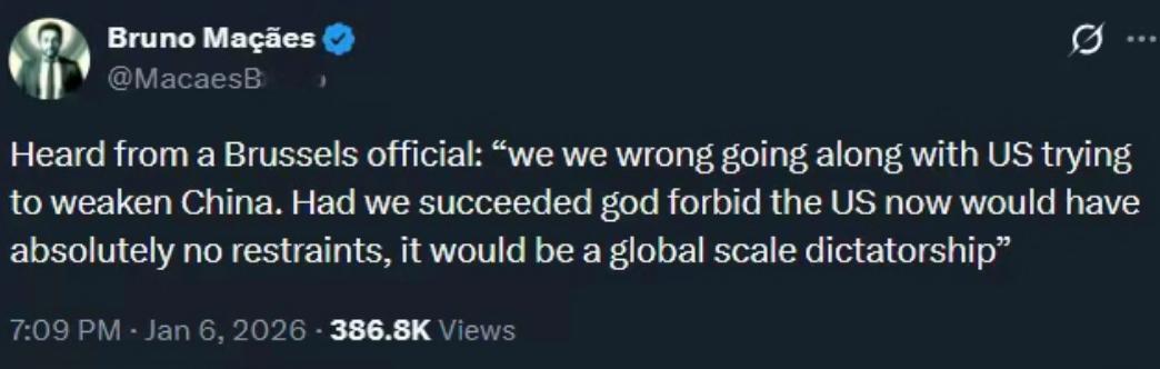 欧洲官员:如果我们支持美国削弱中国成功了,美国将是一个全球范围的独裁政权! 说这话的不是无名之辈,而是葡萄牙前外交欧洲事务部部长布鲁诺·玛萨艾斯,现在还担任着伦敦Flint Global的高级顾问,不管是过去的官方身份还是现在的智库角色,都让他对欧美关系和国际格局有着足够的话语权。 他这番言论不是在正式会议上的官样文章,而是通过社交媒体直接发声,看得出来是憋了很久的真心话。 可能有人会觉得这话说得太极端,但看看最近欧美之间的互动,就能明白他为啥会这么说。 这几年欧洲确实跟着美国的脚步,在经贸、科技等领域对中国搞了不少限制性举措,比如学着美国搞半导体技术出口管制,以“国家安全”为借口限制中国5G企业进入市场,还提高了中国企业收购欧洲高科技、能源企业的审批门槛。 可欧洲的配合换来了什么呢?别说好处了,反而频频被美国“敲竹杠”,就说最近闹得沸沸扬扬的格陵兰岛事件。 美国总统多次扬言要得到这个丹麦的自治领地,甚至不排除动用武力,这让丹麦、瑞典、德国等欧洲国家都坐不住了,纷纷站出来批评美国不尊重国际法和领土主权。 要知道,丹麦可是美国多年的北约盟友,连盟友的利益都敢随便觊觎,美国的霸权嘴脸暴露无遗。 布鲁诺的话其实点透了一个关键问题:欧洲跟着美国针对中国,本质上是在养虎为患。 这么说吧,美国一直想维持自己的全球霸权,中国的发展让它感到了威胁,于是拉着欧洲盟友一起施压。 可一旦中国被削弱,失去了制衡美国的重要力量,没有了约束的美国只会更加肆无忌惮,到时候第一个遭殃的可能就是这些欧洲盟友。 毕竟美国连国际法都敢公然无视,之前就有总统直言,自己的“道德标准和意志”是指挥军事行动的唯一制约因素,这样的国家要是没了制衡,后果不堪设想。 现在欧洲内部其实已经有了不少清醒的声音,除了布鲁诺,法国总统也公开谴责这种“新帝国主义”,直言欧洲正面临被强权逻辑边缘化的风险;德国前总统也说,美国背离了战后国际秩序的价值理念,再这么下去世界会变成“强盗窝”。 更能说明问题的是,有民调显示,76%的德国民众认为美国不再是可靠的伙伴,这可是相关调查开展以来的最低水平。 说到底,国与国之间没有永远的盟友,只有永恒的利益,欧洲要是继续跟着美国的节奏走,放弃和中国的合作机会,反而纵容美国的霸权扩张,最终只会搬起石头砸自己的脚。 布鲁诺的发言,与其说是警告,不如说是给欧洲提了个醒:是时候认清现实,坚持自己的战略自主,而不是做美国霸权的附庸了。