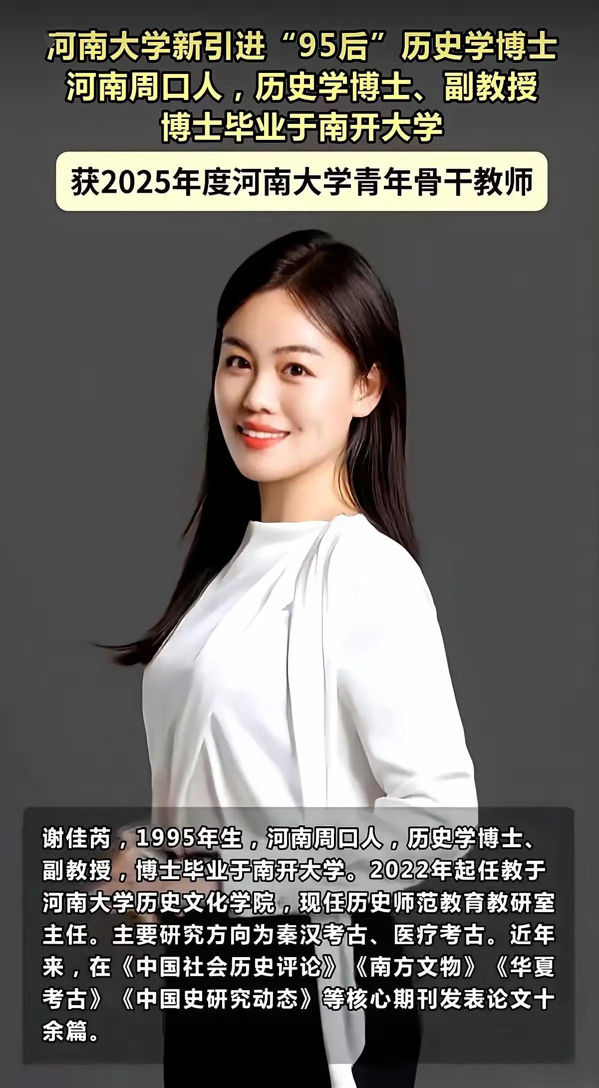 真是年轻有为。谢佳苪,河南周口人。九五后历史学博士,毕业于南开大学。河南大学副教授。 同样的年龄段,大家都还在公司里做牛马,为房贷,车贷发愁,还为能不能找到另一半而寻觅。 别人都已经实现质的飞跃。努力的方向不一样。努力的力度不一样,得到的结果也不一样。