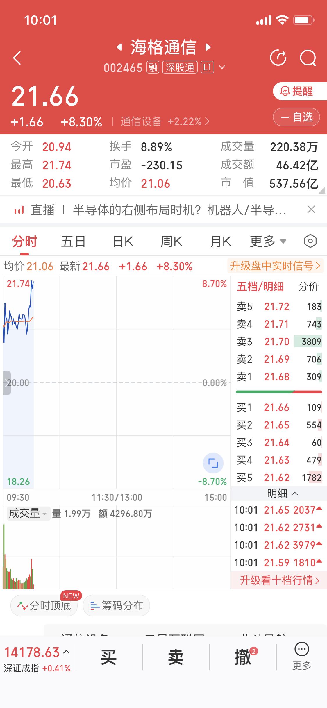 1月12日上周五股价0轴线买的,我果断买入海格通信。当时就有人泼冷水,说我当天要被套。我可没被这说法影响,坚持自己的判断。 这不,到今天上午,它已经涨了8个点,离涨停就差一步之遥,而且还没有异动监管,这走势太让人惊喜了。我心里那叫一个得意,事实证明我的眼光没错。在股市里,就得有点自己的主见,不能人家说啥就是啥。现在就盼着它赶紧涨停,给我带来更多收益。