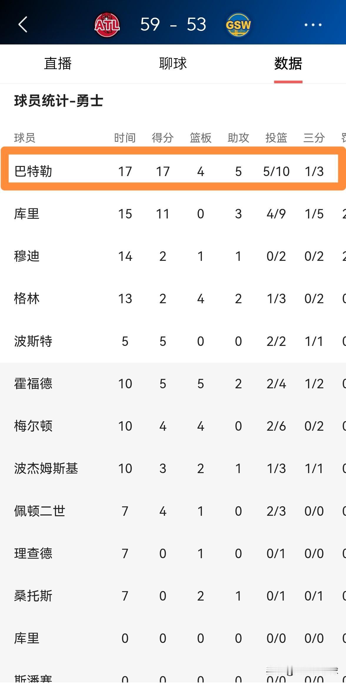 勇士超级球星巴特勒终于不装死了!在今天勇士主场迎战老鹰的比赛中,目前双方半场战罢,勇士以53:59落后于对手。值得一提的是,在前两节比赛中,巴特勒在其他队友发挥不佳的情况下终于发力了,他在首发出战的17分钟里,投篮10中5,其中三分球3中1、罚球6中6砍下17分4篮板5助攻1抢断,他的场上正负值为-4。