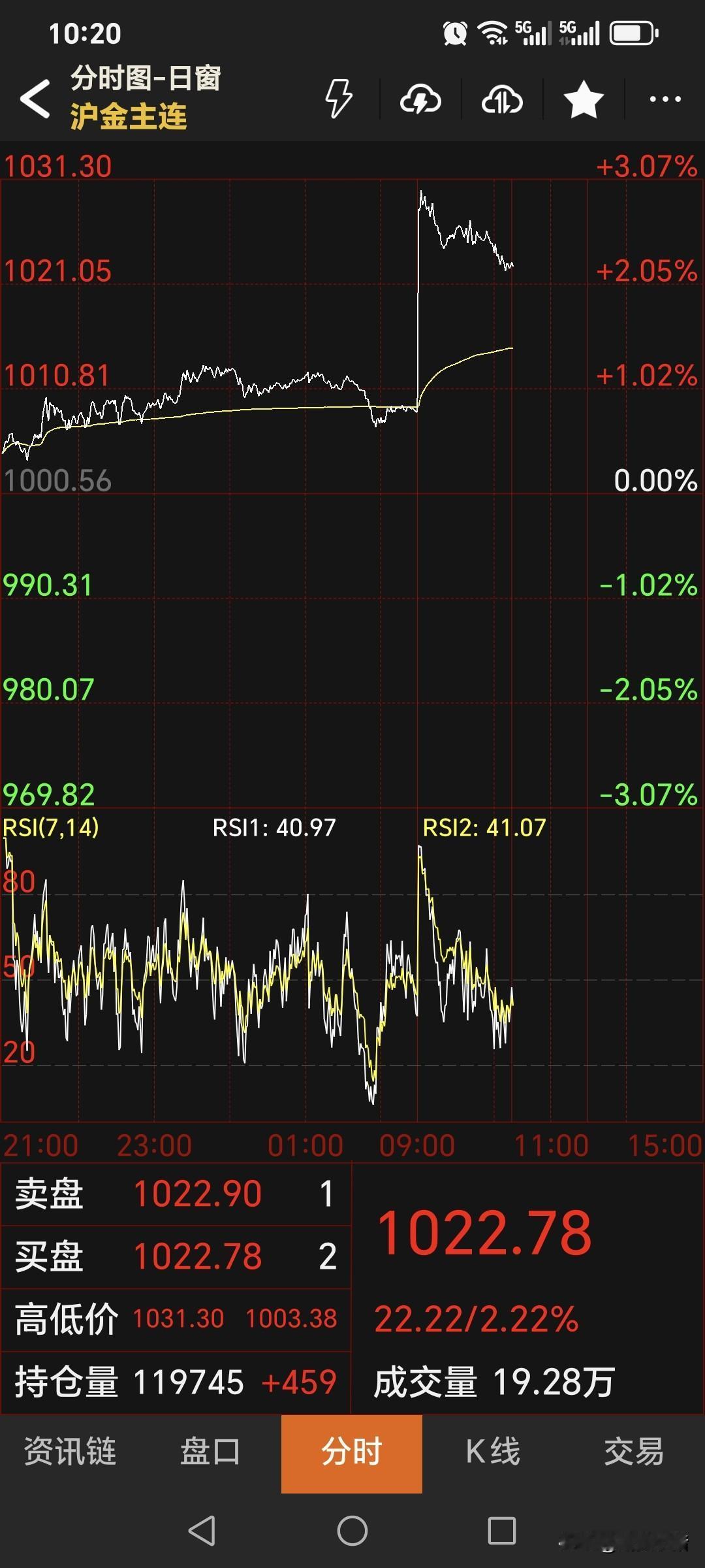 又到了商品市场, 中场休息一刻钟时间, 但是内心五味杂陈。 日内恢复交易后, 国内黄金期货直线拉升, 虽说略微减弱, 但是截止10:15分, 国内黄金期货 主力合约停收于1022.78元。 错过可能就是永远, 不追,继续仰望吧!