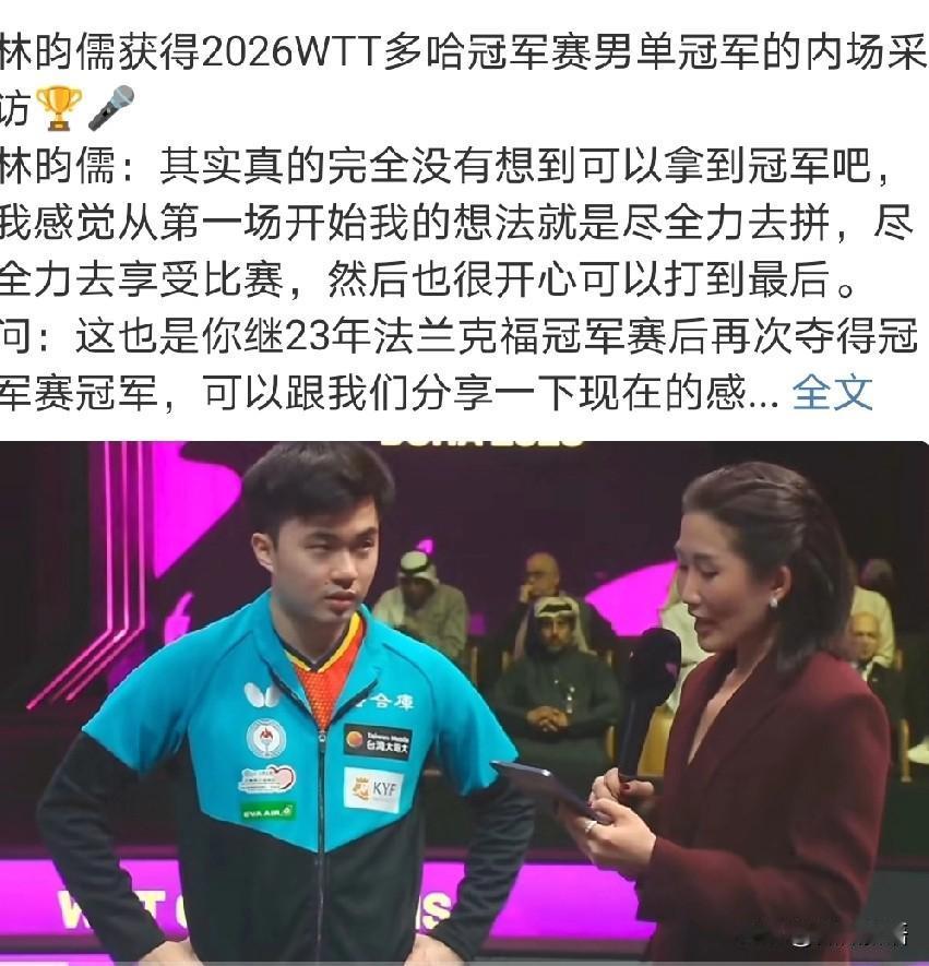 林昀儒总结多哈冠军赛的比赛:换了新球拍,适应的不错。 刚刚看了小马哥采访林昀儒,这次林昀儒说了很多话,果然拿了冠军就是不一样,采访时话也多了。林昀儒说没想到这一站自己的状态会这么好,对于和张本智和的那场比赛,林昀儒说自己打的还是更坚定吧。在决赛中,林昀儒是4-0战胜了张禹珍,看得出来林昀儒和换的新球拍磨合的不错。林昀儒夺冠后,教练也笑的很开心! 2025年这一年的时间里,林昀儒试了差不多40多支板,看来这次的拍用的不错,一个主板对运动员来说确实非常的重要。时隔两年的时间,林昀儒再次拿到了WTT冠军赛的冠军,这1000积分到手后,林昀儒将重返世界前十。 换了教练后,林昀儒也要和教练磨合,新教练每次我场外,情绪价值拉满,大家说林昀儒喊不出来,教练在场外代喊,特别是和张本智和的比赛,教练喊的也大声。林昀儒说自己也没想到能拿冠军,从一开始他的想法就是尽全力去拼,尽力享受比赛,然后也很开心可以打到最后。新年的第一个冠军,恭喜林昀儒突破自己,继续加油吧!