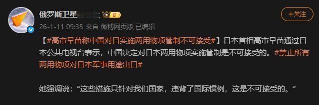 日本首相高市早苗通过日本公共电视台表示,中国决定对日本两用物项实施管制是不可接受的。 她强调说:“这些措施只针对我们国家,违背了国际惯例,这是不可接受的。” 显然,日方要求中方撤回该措施的努力失败了,所以高市不得不站出来发声,但是高市应该要明白这场管制从来不是中方突然的“针对”,而是日方步步紧逼挑战中方底线后的必然结果。 高市口中的“违背国际惯例”,更像是为自己的错误行为找借口,完全无视了事情的来龙去脉和国际社会的通行规则。 事实上,中方1月6日通过商务部发布的这项管制措施,核心目标只有一个:捍卫国家主权安全,遏制日本右翼势力的“再军事化”图谋。 高市早苗恐怕选择性遗忘了,中方出手的直接导火索正是她本人的不当言论,2025年11月她在国会答辩时公然就台湾问题发表谬论,称“台湾出事可能构成日本的存亡危机事态”,这番话明摆着是在干涉中国内政,甚至暗含武力介入的信号。 要知道,台湾问题是中国的核心利益,任何外部势力的挑衅都必然会遭到强烈反制,中方当时就通过外交渠道多次表达不满,可日方不仅没有收回错误言论,反而继续推进扩军计划,2026财年的防卫相关预算更是涨到了9.04万亿日元,较2018年增幅高达七成。这种一边挑衅一边扩军的操作,让中方不得不采取实际行动筑牢安全防线。 再说说高市所谓的“违背国际惯例”,这其实是典型的偷换概念,全球各国都有权对两用物项实施出口管制,这是国际社会的通行做法,就连日本参与的《瓦森纳协定》,也明确允许成员国基于国家安全自主制定出口管制措施。 中方此次管制覆盖了超过900种两用物项,不仅包括稀土、钨粉等材料,还涉及软件、技术和设备部件,看似范围广泛,实则精准指向军事用途。 简单说,民用领域的正常贸易完全不受影响,中方要堵的,是这些物项流入日本军工体系、助力其提升军事实力的通道。 可能有人不清楚,这些看似普通的“两用物项”,对军事扩张有多重要,比如钨粉,既能用于民用机械制造,更是穿甲弹芯、航空发动机的核心材料;端羟基聚丁二烯是民用化工原料,同时也是导弹推进剂的关键成分。 而日本对中国这类物项的依赖度极高,仅2024年,日本从中国进口的两用物项总额就达10.7万亿日元,占自华进口总额的42%,更关键的是日本长期实行“寓军于民”的策略,很多民用企业背后都深度参与军工生产,三菱重工、三菱电气等企业更是直接承接防卫省的核心项目,若不对物项用途严格管控,无异于给日本军国主义复燃递工具。 所以,高市早苗应该明白,中方此次措施绝非一时冲动,而是对日本右翼势力的明确警示,战后国际秩序早已明确限制日本的军事扩张,《开罗宣言》《波茨坦公告》都要求日本完全解除武装,可日本近年来不断突破宪法限制,修订安保文件、增加防卫预算,种种举动都引发地区国家警惕。 中方用国际通行的管制手段划定红线,本质上是在维护地区和平稳定,如果日方继续执迷不悟,无视中方核心利益,一味推进“再军事化”,未来面临的制约只会更多。 说到底,这场争端的症结从来不在中方的管制措施,而在日方的错误言行,高市早苗与其站出来抱怨“不可接受”,不如静下心来反思:究竟是中方的措施过分,还是日本的野心越界?只有正视历史、尊重他国主权,停止挑衅行为,中日关系才能回到正轨,这才是日本该走的正道。