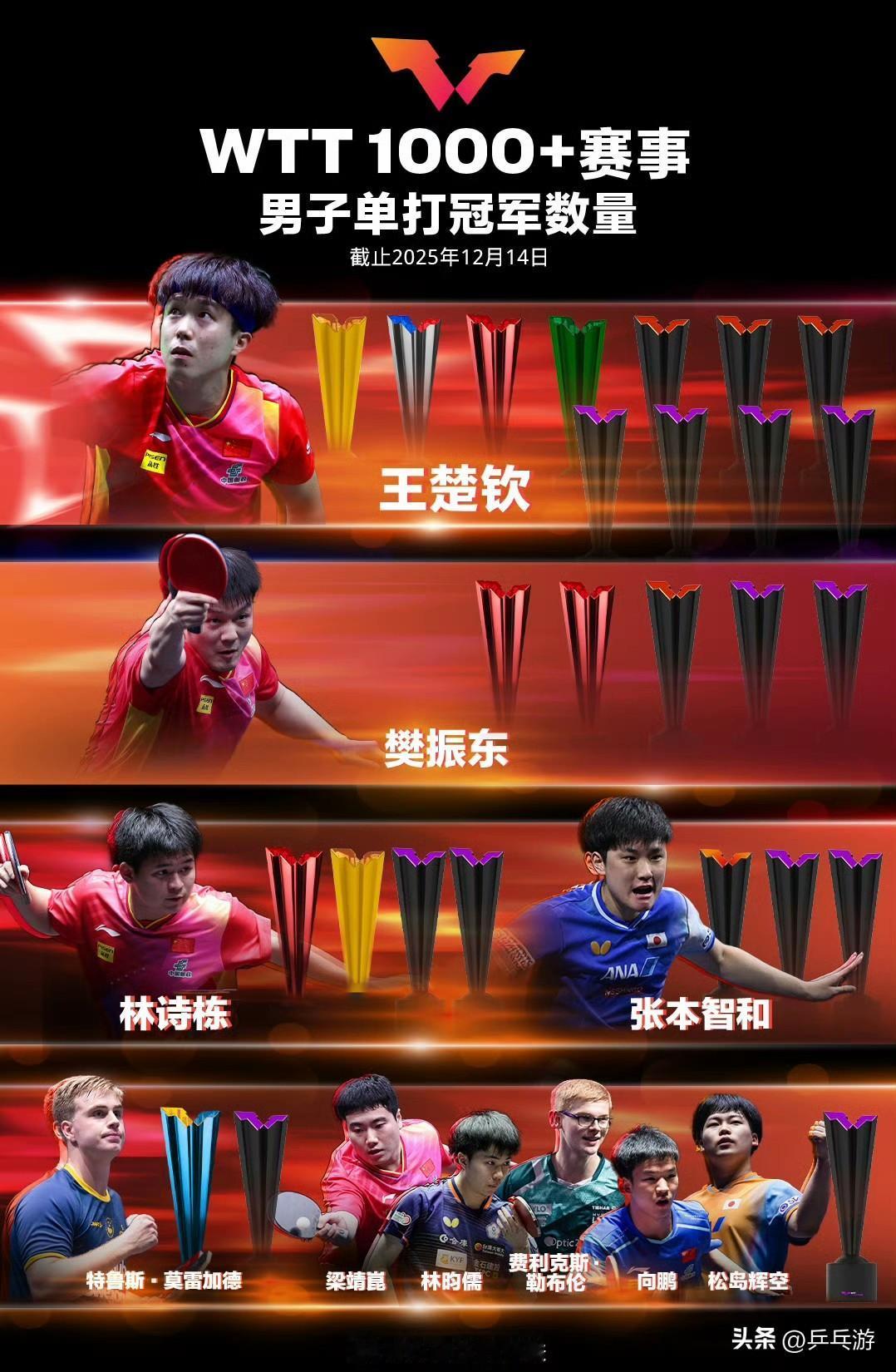 🏓截至多哈冠军赛结束,有哪几位运动员既获得过WTT冠军赛冠军,也获得过WTT大满贯赛冠军? [送自己一朵花]【女】 1. 孙颖莎 ——4个大满贯冠军,7个冠军赛冠军。 2. 王曼昱——2个大满贯冠军,3个冠军赛冠军。 3. 朱雨玲——各1个 [送自己一朵花]【男】 1. 王楚钦 ——各4个 2. 樊振东——各2个 3. 林诗栋——各2个 4. 莫雷加德——各1个 ~~~~~~~~~~~~ (图片为多哈冠军赛之前的WTT1000+赛事冠军榜)