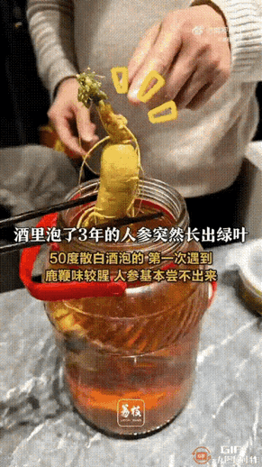 太新奇了!上海一名男子用人参泡酒泡了三年,本想着朋友聚会时,拿出来和大家一起分享,没想到打开一看,发现人参居然长出绿叶了。 事情要从三年前说起,陈先生常年在外地跑业务,听老家长辈说50度以上的纯粮酒泡人参、鹿鞭能温补身体。 特意托东北的亲戚选了两棵4年生的鲜人参,根茎饱满、根须完整,还带着山林里的湿润气息。 回到上海后,他又去老字号酒坊打了十斤50度的高粱散酒,按照长辈教的方法,把人参、鹿鞭连同几片枸杞一起放进了提前消毒晾干的玻璃罐里。 倒酒时确保完全没过食材,拧紧盖子后还缠了两层保鲜膜,生怕密封不严影响浸泡效果,之后就把罐子塞进了书房的储物柜,打算泡满三年再和亲友分享这份“养生佳酿”。 这三年里,陈先生的生活忙忙碌碌,只有逢年过节整理储物柜时才会想起这瓶药酒。 半年前他曾打开过一次,倒了小半杯尝尝味道,只觉得酒液醇厚,带着淡淡的参香和药味,罐子里的人参和鹿鞭形态没什么变化,根须依旧舒展,他便放心地重新封好放回原处,没再多留意。 直到上周六,几位大学同学来家里聚会,聊起养生话题时,有人提到了药酒,陈先生才猛然想起这坛藏了三年的“宝贝”,兴冲冲地跑去书房把玻璃罐抱了出来。 刚放在餐桌上,一位眼尖的朋友就指着罐子喊了一声:“老陈,你这人参顶上怎么绿油油的?” 陈先生一开始以为是酒液沉淀或者长了霉菌,凑近仔细一看,瞬间愣住了——玻璃罐里,那根泡了三年的人参芦头处,竟然冒出了三四片嫩绿的新叶。 最长的一片有近两厘米,叶片舒展、脉络清晰,在透明的酒液中透着生机,看起来就像刚从土里挖出来的新鲜人参。 更让人意外的是,原本略显干瘪的参体似乎变得水润了些,根须也比之前饱满了不少,完全不像泡在高度酒里三年的样子。 “这也太邪门了!酒里泡着还能发芽?”朋友们纷纷围了过来,有人掏出手机拍照录像,有人忍不住伸手摸了摸罐壁。 还有人开玩笑说这是“成精了”,连喝了几十年酒的老大哥都连连感叹,活了大半辈子从没见过这种奇观。 陈先生自己也觉得新奇又困惑,他反复确认罐子密封得还算严实,50度的高度白酒按说能抑制微生物生长,怎么人参还能发芽长叶?他把这段视频发到社交平台后。 很快就引发了网友热议,短短一天就收获了几十万点赞,有人分享自己泡了五年的人参都没动静,也有人说老家曾有过类似案例,没想到真能亲眼见到。 随着话题热度上涨,植物学专家和中医药领域的专业人士也纷纷给出了解释,解开了大家的疑惑。 专家表示,这种现象虽然罕见,但并非超自然奇迹,而是多重条件叠加的结果。 陈先生用的是新鲜人参,采挖后很快就泡入酒中,芦头处的潜伏芽没有受损,保留了部分活细胞,处于“休眠”状态。 50度的白酒虽然度数不低,但没有达到医用酒精70度的杀菌标准,没能完全杀死参体的活性细胞。 再加上玻璃罐的密封并非绝对严密,三年间有微量空气进入,酒液中的水分溶解了少量氧气。 而书房储物柜长期保持15-25℃的恒温,避光且温度稳定,恰好满足了潜伏芽萌发的条件,这才造就了“酒中长叶”的奇观。 不过专家也特别提醒,这瓶药酒虽然神奇,但已经不适合饮用了。 人参发芽会消耗自身的皂苷等营养成分,导致滋补功效大幅下降,同时酒精挥发可能让酒精度降低,微量空气进入还可能滋生微生物,存在变质风险。 而且人参和鹿鞭都属于温补类食材,本身就有特定适用人群,阴虚火旺者饮用本就可能上火,变质后饮用风险更高。 像陈先生这样的鲜人参泡酒,建议在1年内饮用完毕,即便用50度以上的高度白酒,浸泡时间也不宜超过3年,泡制前还要将人参彻底清洗晾干,避免带水入酒导致变质。 如今陈先生给玻璃罐做了个简易底座,摆在家里的展示架上,每天都会观察人参的生长情况,发现又冒出了一片小嫩叶。 这株在高度白酒中坚守三年,顽强萌发的人参,不仅让大家见识到了植物强大的生命力,也给喜爱自制药酒的人提了个醒。 原来泡酒并非越久越好,遵循科学方法才能既保证功效又保障安全,而生活里这些突如其来的小奇观,也正是平凡日子里藏不住的小惊喜。
