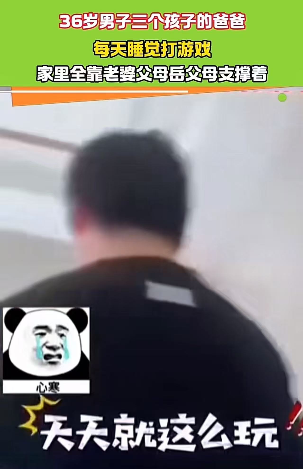 36岁男子是三个孩子的爸爸,却不出去上班赚钱,每天在家睡觉打游戏,家里全靠老婆父母,岳父岳母支撑着。这天老婆累的崩溃大骂:“天天就知道玩游戏,你多大的人了?”网友:这种人也有老婆?