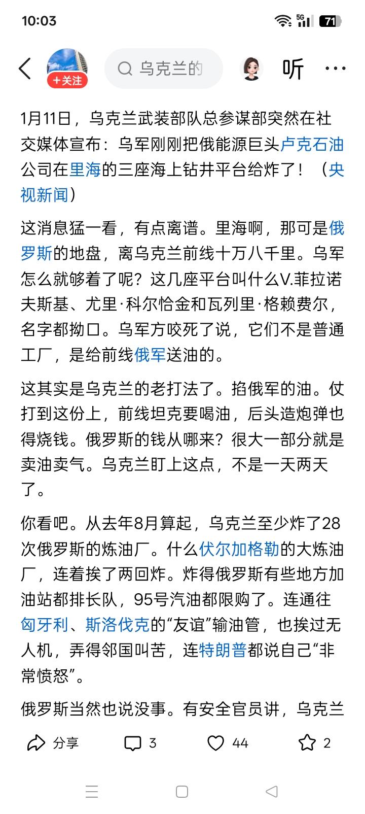 痛也没办法? 乌克兰的前线地面战场上,好像并不是那么要紧,也就是捉襟见肘,岌岌可危的情况,因为乌克兰军队总参谋部1月11日在网络上公开宣布,乌克兰特种部队刚刚在不久前跑到千公里之外的里海,将俄罗斯卢克石油公司的三座海上石油钻井平台给爆炸和摧毁了。 这种情况,至少说明了乌克兰在地面战场上并没有陷入严重的危机四伏之中。如果乌克兰是在地面前线战场上漏洞百出,甚至是抵挡不住,上下人心惶惶的时候,估计也没有什么心思、精力和军事力量,跑到千公里之遥的里海去炸什么卢克石油公司的钻井平台了。 乌克兰持续不断对俄罗斯境内的这种易燃易爆的油气工厂企业和设施设备的袭击,大概俄罗斯也感觉到了痛,此前也提出过“暂停对油气能源设施袭击的协议”,但在战争中互相持续进行空袭的情况下,最终也是无疾而终。 当然,乌克兰国内也同样遭到了俄罗斯各种型号的导弹和无人机的袭击,但乌克兰无疑得到了国际社会上相当多支持,其修复和重建的能力,估计一般人无法想象。比如日本好像就有企业或人员长期在乌克兰帮助处理战争遗留问题,以及帮助重建工作,这种情况,又有多少人知道呢。