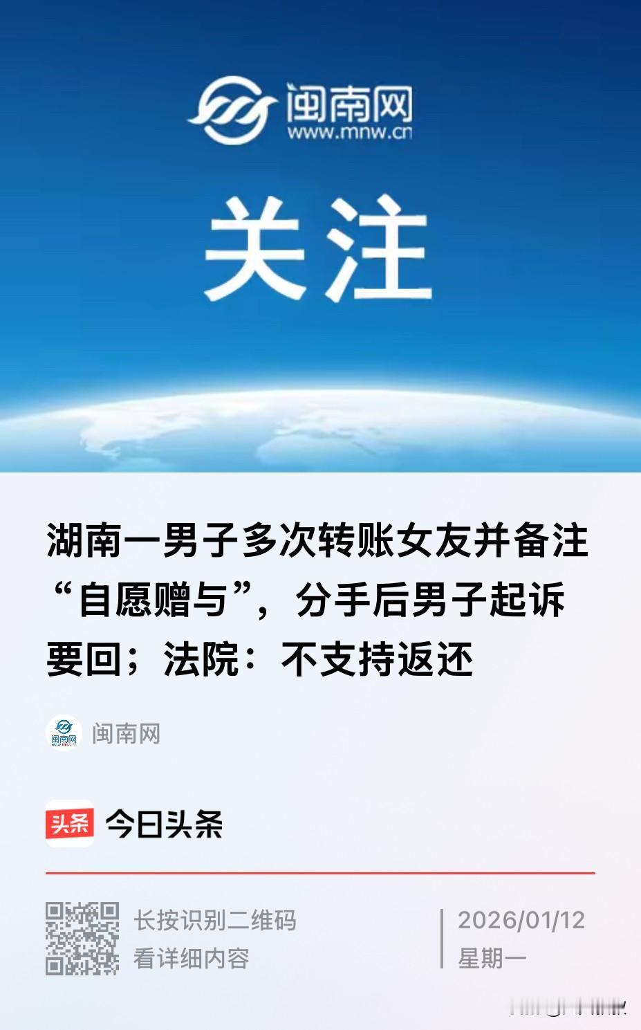 湖南张家界,一男子经人介绍认识了一女子,男子对女子非常满意,于是便展开追求,期间,男子多次给女子转账,转账时为了表心意还特意备注“自愿赠与,永不追回”的字样,可是男子追了一年多还是没追上,关系破裂后,男子将女子告上了法院,要求女子退还转账2.4万多元。 据悉,男子张某经人介绍认识了女子王某,无论是外貌还是举止谈吐,张某对王某还是比较满意的,可是,王某似乎对张某却并不感冒。 此时,张某便对王某展开了追求,无论是节假日还是对方生日,张某总是给对方转账,金额从58元到3000元不等,其中,不少转账还特意备注了“自愿赠与,永不追回”的字样,还有部分转账数字也比较特殊,比如520、1314等。 然而,张某追了对方一年还是没追上,两人的关系反倒急转直下,最终,张某发现自己被对方拉黑了。 事发后,张某将王某告上了法院,要求王某退还这一年多以来的转账2.4万余元。 事发后,网友则调侃,以后转账千万不要写什么自愿赠与,就写以结婚为目的的赠与,这样对方如果不愿意和你结婚,就保证不会收。 还有网友则表示,每笔转账都是写的自愿赠与,永不追回的话,那么分手之后不应该再要了。 也有网友说,这么明显的坑,男的难道看不出来吗,什么是自己备注的, 明明是对方要求的。 那么,从法律层面来说,张某能不能要回这些财产? 其实,张某在转账上已经明确说明了,就是自愿赠与,民法典规定,赠与人在赠与财产的权利转移之前可以撤销赠与。 本案中,张某已经转账完成,而且这是赠与合同,所以,张某想要从赠与方面,要回这笔钱的可能性已经不存在了。 但是,如果从彩礼方面讨要呢? 关于审理涉彩礼纠纷案件适用法律若干问题的规定下列情形给付的财物,不属于彩礼:(一) 一方在节日、生日等有特殊纪念意义时点给付的价值不大的礼物、礼金;(二) 一方为表达或者增进感情的日常消费性支出;(三) 其他价值不大的财物。 显然,上述三种费用,即便按照彩礼也是无法要回来的。其中,张某就有节日和对方生日为其转账,以及表达增进感情的一些转账,所以,这些转账时无法要回来的。 最后,经过法院核查,扣除女方给男方的转账后,男方给女方转账差额是1.6万元,其中有9000余元备注了“自愿赠与,永不追回”的字样,剩余部分为原被告之间请客吃饭,购物,汽车加油以及充值等,因此,法院最终没能支持张某的诉求,而是全部予以了驳回处理。 其实,1.6万元转账看似不多,但是已经不少了,但是结合两人关系存续1年多的跨度来看,这1.6万似乎又不算多,最终法院没有支持的理由就是男方是自愿赠与的,所以说,以后转账还是不要备注了,如果一定要备注,就如网友说的一样,以结婚为目的,不然的话,就要做好这笔钱要不回来的打算。 对此,你对本案有什么看法? —————————— 关注我,带你评析法律热点,关注冷暖人生。 文章原创,抄袭必究