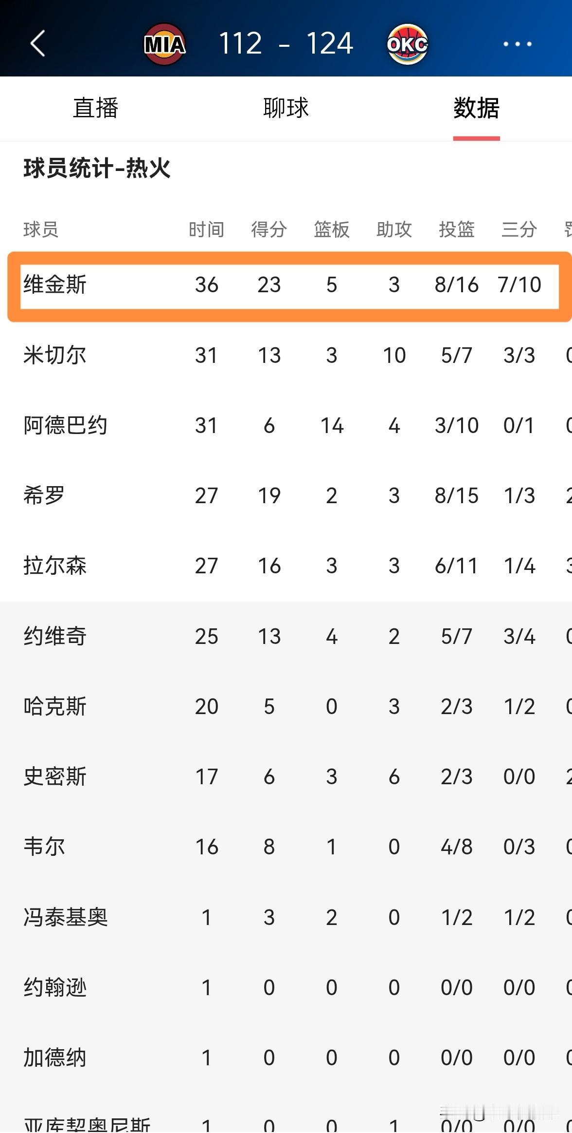 热火球星维金斯真是彻底的怒了!在今天热火客场以112:124不敌雷霆的比赛中,维金斯火力全开怒砍23分。 全场比赛下来,维金斯首发出战36分钟,投篮16中8,其中三分球10中7怒砍23分5篮板3助攻2抢断1盖帽,还有6次失误,他的场上正负值为-14。 在热火头号得分手鲍威尔缺阵的情况下,维金斯怒摔保温杯打出了一场久违的高得分表现。