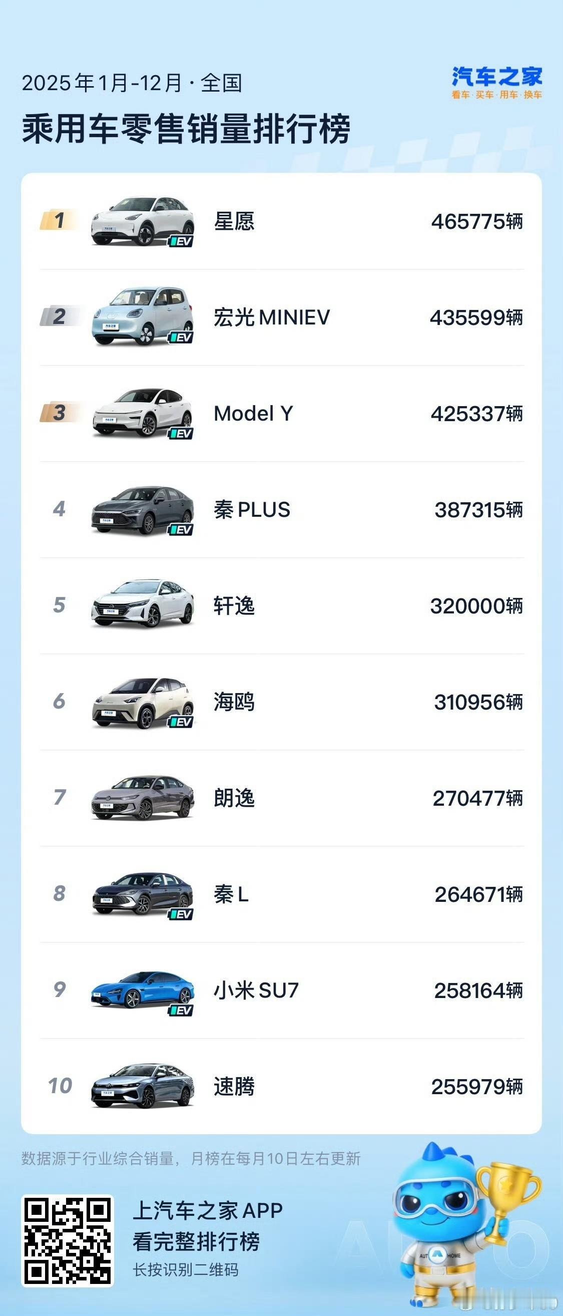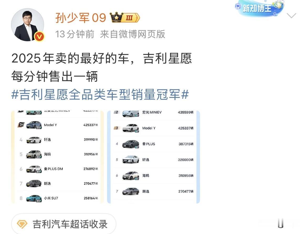 孙少军:2025年吉利星愿,每分钟售出一辆! 就是刚才 ,孙少军放出来这个数据,去年星愿的销售数量超过了46万辆,换算成大家容易理解的概念就是,每一分钟,他这个车就会卖出去一辆! 当然也有较真的朋友换算了一下,就拿一年365天来换算,每天24小时,每小时60分,一共525600分钟,换算下来每分钟卖0.8335台,其实这与一台的差距也不大[捂脸] 不然看到这个榜单更多的人,根本就不关心星愿卖多少,因为他们看到了另外一个更加恐怖的数字,那就是特斯拉的ModeL Y,这款均价28万左右的车,去年居然能够能卖42.5万辆,这才是恐怖如斯! 而且这个车好像在网上的风评不是这么好,但是他线下就是这么多人买,这一点确实挺让人意外的,到底是什么原因,目前没有一个同行能够破解,不然大家也能够靠近这个数字了。