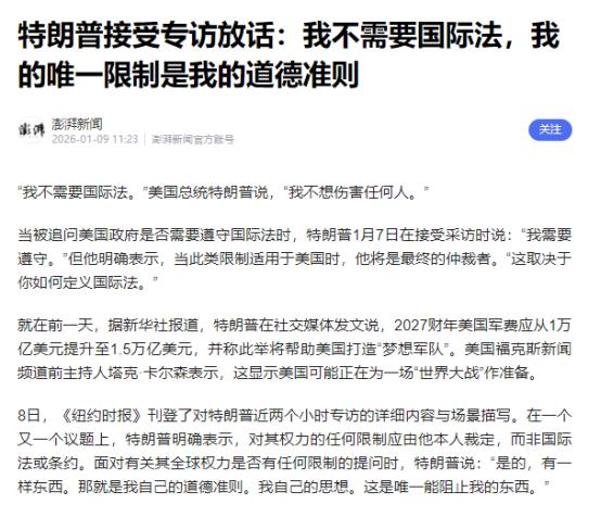美国总统特朗普宣布了! 2026年1月10日,美国总统特朗普公开扬言,他“不需要国际法”,只凭自己个人的道德标准行事。联合国秘书长古特雷斯随后回应,强调所有成员国都必须尊重自己共同创立的国际法。这番言论并非空谈,就在几天前,美国刚刚对委内瑞拉发动军事行动并控制其总统,这已被联合国秘书长称为一个“危险的先例”。 国际法与以联合国为核心的国际体系,本是二战后各国为避免重蹈战争覆辙共同搭建的安全屏障,《联合国宪章》明确规定所有成员国主权平等,禁止使用武力或武力威胁侵害他国领土完整与政治独立,这是国际社会公认的行为底线。 但对特朗普政府而言,这些规则早已成为其推行霸权的束缚,从首个任期开始,美国就掀起大规模“退群”浪潮,先后退出《巴黎协定》、伊朗核问题全面协议、世界卫生组织等多个关键国际机制,将“美国优先”凌驾于全球共同利益之上。 2025年重返白宫后,退群步伐进一步加快,上任不久就再次退出世界卫生组织和《巴黎协定》,随后又退出联合国人权理事会,最终一次性宣布退出31个联合国实体和35个非联合国组织,覆盖气候、经济、法律等多个领域,本质上就是通过系统性背离多边机制,摆脱国际规则对其行为的制约。 这种对国际规则的漠视,最终演变成对委内瑞拉的直接军事干预。 美国对委内瑞拉的觊觎由来已久,这个拥有全球最大已探明石油储量的国家,其重油资源与美国本土炼油设施高度互补,控制其能源出口能显著增强美国对全球能源定价权的主导力,而特朗普政府一直以扩大石油产量、降低国内油价为重要政治诉求,能源利益成为其动武的核心诱因之一。 更深层的动因在于地缘政治野心,特朗普政府在2025年公布的《国家安全战略》中明确提出回归“门罗主义”,宣称要强化美国在西半球的主导地位,而扣押马杜罗、试图扶持亲美政权,正是这种“美洲是美国的美洲”霸权思维的具体实践,特朗普甚至直言委内瑞拉的未来将“由美国决定”,毫不掩饰其干涉他国内政的企图。 这场未经联合国安理会授权的军事行动,彻底打破了国际法的核心禁忌。联合国秘书长古特雷斯称之为“危险的先例”,正是因为这种“强权即公理”的逻辑一旦得逞,将动摇整个国际秩序的根基。 在联合国安理会紧急会议上,俄罗斯、巴西、哥伦比亚等众多国家纷纷谴责美国侵犯委内瑞拉主权,不结盟运动也明确反对这种单边武力行径,连美国经济学家杰弗里·萨克斯都指出,安理会的核心任务是捍卫国际法,否则人类将面临无序风险。 这些反对声音背后,是国际社会对“榜样效应”的深切担忧——如果作为联合国安理会常任理事国的美国都能随意践踏规则,其他国家可能纷纷效仿,用武力解决争端,最终导致全球陷入“丛林法则”的混乱。 美国的行为本质上是将自身利益绝对化,把国际社会共同创立的规则工具化。特朗普口中的“个人道德标准”,说到底就是“美国利益至上”的霸权逻辑,只要不符合自身诉求,要么退出国际组织逃避责任,要么直接动用武力强行推进,这种做法早已引发国际社会的普遍警惕。 南非《星报》曾一针见血地指出,只要国际机制无法满足美国的霸权诉求,甚至形成制约,美国便会毫不犹豫地破坏规则。 从推迟销毁化学武器库存、消极履行《禁止化学武器公约》义务,到拒绝参与全球气候变化合作,再到如今对委内瑞拉动武,美国的一系列操作,正在不断消耗其作为战后国际体系缔造者积累的信誉。 更值得警惕的是这种单边行径不仅破坏国际秩序,还会引发连锁性危机。 委内瑞拉局势已显现出混乱迹象,美国的军事干预可能导致当地陷入派系混战与难民潮,而这种地区动荡最终也会反噬美国自身——国际资本对美投资的谨慎态度、全球绿色产业规则制定中的话语权丧失,都是美国为单边主义付出的隐性代价。 《洛杉矶时报》早已指出,频繁退群与单边行动正在加剧美国的国际孤立,让其主动放弃了在多个领域的影响力。 从本质上看,特朗普的言论与美国的行动,是多极化趋势下霸权国家的焦虑反应。随着世界格局的深刻变化,美国难以再凭一己之力主导全球事务,便试图通过破坏规则、动用武力等极端方式维持优势。 但历史已经证明,单边主义从来没有出路,二战的惨痛教训催生了国际法与联合国,而如今国际社会对美国行径的广泛谴责,正是对多边主义的坚定捍卫。 特朗普所谓的“个人道德标准”,终究无法替代各国共同认可的国际法,而“危险的先例”能否被遏制,不仅关乎委内瑞拉的命运,更关乎整个国际社会的和平与稳定。