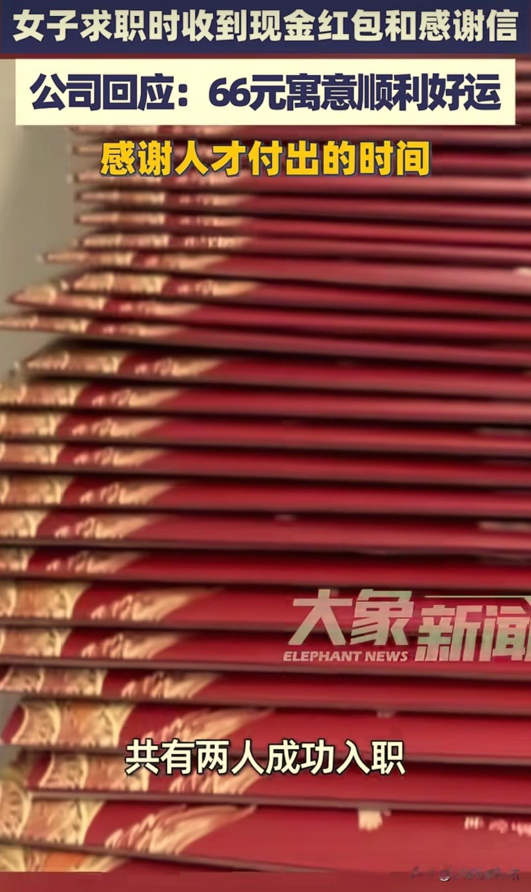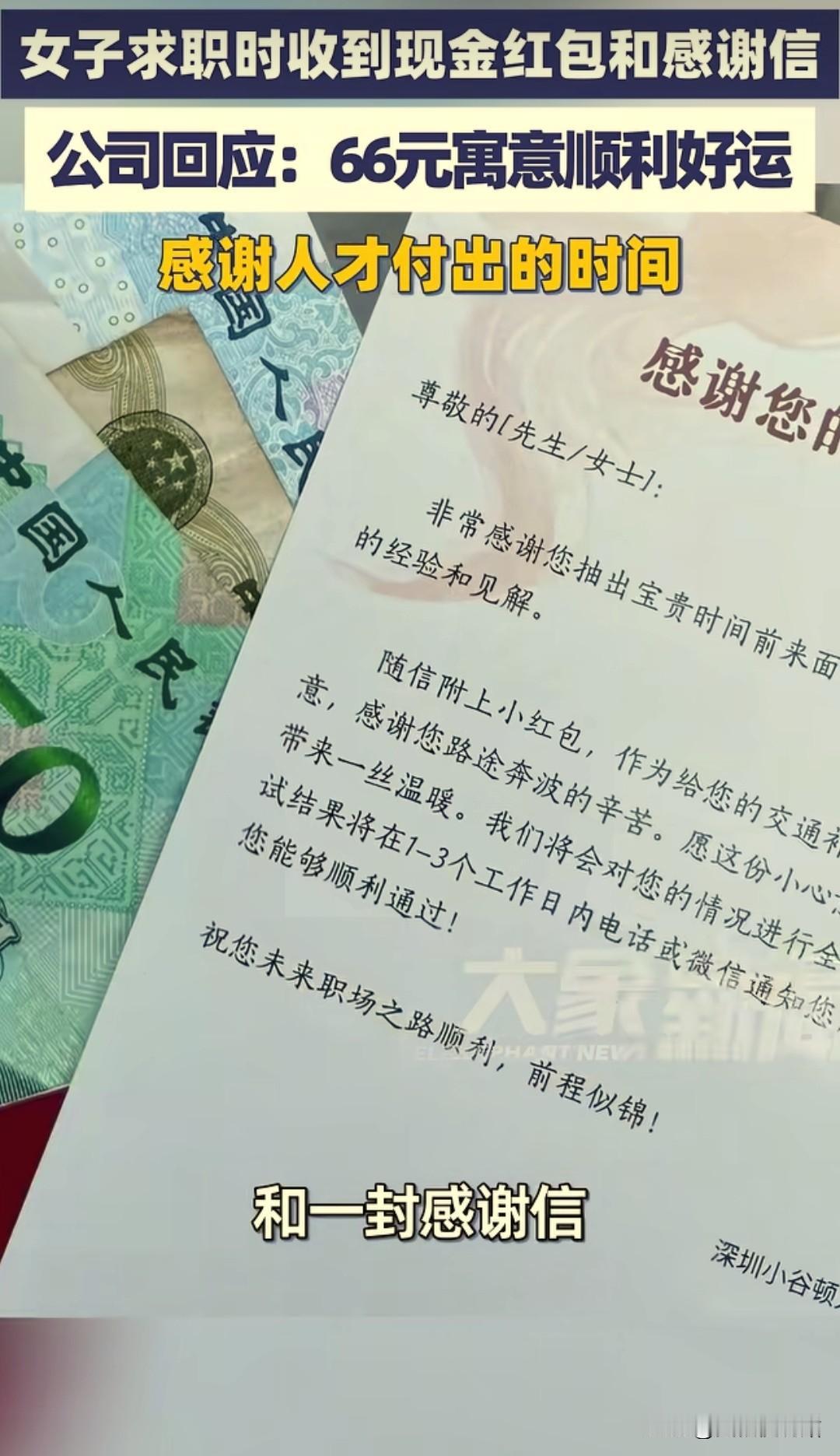 万万没想到!深圳,一女子面试工作,正准备离开时,人事却突然叫住了她,女子以为面试又要出问题,没成想人事竟然递给她一个66元的红包和一封感谢信,还说:“这是公司对人才的尊重。”女子瞬间被感动了,紧张的情绪一下子就清空了。网友:这是什么神 仙公司啊! 那天面试结束的时候,她其实已经不太抱希望了,不是表现得不好,而是这段时间这样的场景重复太多次:聊得看起来还行,对方点头微笑,说一句“回去等通知”,然后就再也没有然后。 她把简历收回包里,站起来的时候还有点腿软,心里已经在默默算,这一趟来回地铁加公交,又花了四十多块。 刚走到门口,人事在身后喊了她一声,她下意识回头,第一反应是紧张,还以为是哪里答错了,或者有流程没走完。 对方走过来,语气很平常,从抽屉里拿出一个红包递给她,她当时真的没反应过来,愣了一下,下意识问:“这是……给我的?” 确认之后,她才接过来,红包很薄,不像过年那种,拿在手里轻飘飘的,她没马上拆,只是站在那儿,有点不知所措。 人事笑了笑,说了一句“路上注意安全”,她才低头把红包打开,里面是几张新钞,还有一张小卡片,手写的字,不是打印的。 卡片上的内容很简单,大概就是感谢她今天抽时间过来面试,也说她准备得比较认真。 没有夸张的评价,也没有画饼,就是几句很平实的话,她站在原地把那几行字看完,心里突然有点发酸,说不上来为什么。 她后来回忆,那一刻最明显的感受不是开心,而是不太习惯,因为之前面试太多次,早就习惯了被忽略。 迟到没人道歉、面试官低头回消息、结束后连一句送别都没有,这些都已经成了默认状态,突然有人认真告诉你:“你今天来这一趟,我们是记在心里的”,反而让人有点愣神。 她临走前,人事还特意解释了一句,说这不是针对她一个人的,每个来面试的人都会有,只是金额不一样,一般选个吉利数。 这个月已经面了十几个人,流程都是固定的,她点头应着,心里却一直在想,这家公司应该是早就把这件事当成正经事来做的,而不是临时起意。 回家的路上,她坐在地铁里,把红包又打开看了一眼,66块钱,说实话买不了什么,吃顿饭都不太够。 但她还是忍不住拍了张照片,发到网上,不是炫耀,更像是想记录一下:原来面试也可以是这样结束的。 评论很快就多了起来,有人说羡慕,说自己面试跑断腿,连水都没喝过一口;有人说这公司情商高,懂得尊重人;也有人半信半疑,觉得是不是噱头。 但她自己心里很清楚,这种东西如果只是作秀,是坚持不了多久的,因为对公司来说,真正麻烦的不是钱,而是要多走一步心。 她后来想了想,这段时间最让她疲惫的,其实不是没工作,而是一次次被当成“可替代的人”。 简历像流水线上的产品,被翻两下就放到一边,相比之下,那封手写的卡片反而显得很实在,没有承诺,也没有套路,只是承认她的时间是有价值的。 几天后,她收到录用邮件的时候,并没有特别意外,反而有种“果然如此”的感觉。 她跟朋友说,光看面试这个环节,其实就能判断一家公司的底色,如果连第一次见面都能认真对待,那至少不会太敷衍员工。 后来也有人问她,会不会只是因为一个红包就对公司滤镜太重,她想了想,说不完全是红包,而是那一整套细节:说话的方式、解释的态度、送人到门口的那几步路。 钱只是一个载体,真正让人安心的,是那种被当成“人”对待的感觉。 现在回头看,那66块钱早就花掉了,但那天的画面她记得很清楚,对她来说,那不是什么感动人心的大事,只是在一段灰扑扑的求职经历里,遇到了一次不那么敷衍的结束方式。 很多时候,所谓“好公司”的第一印象,就是从这种不起眼的小地方开始的。 信源:大象新闻