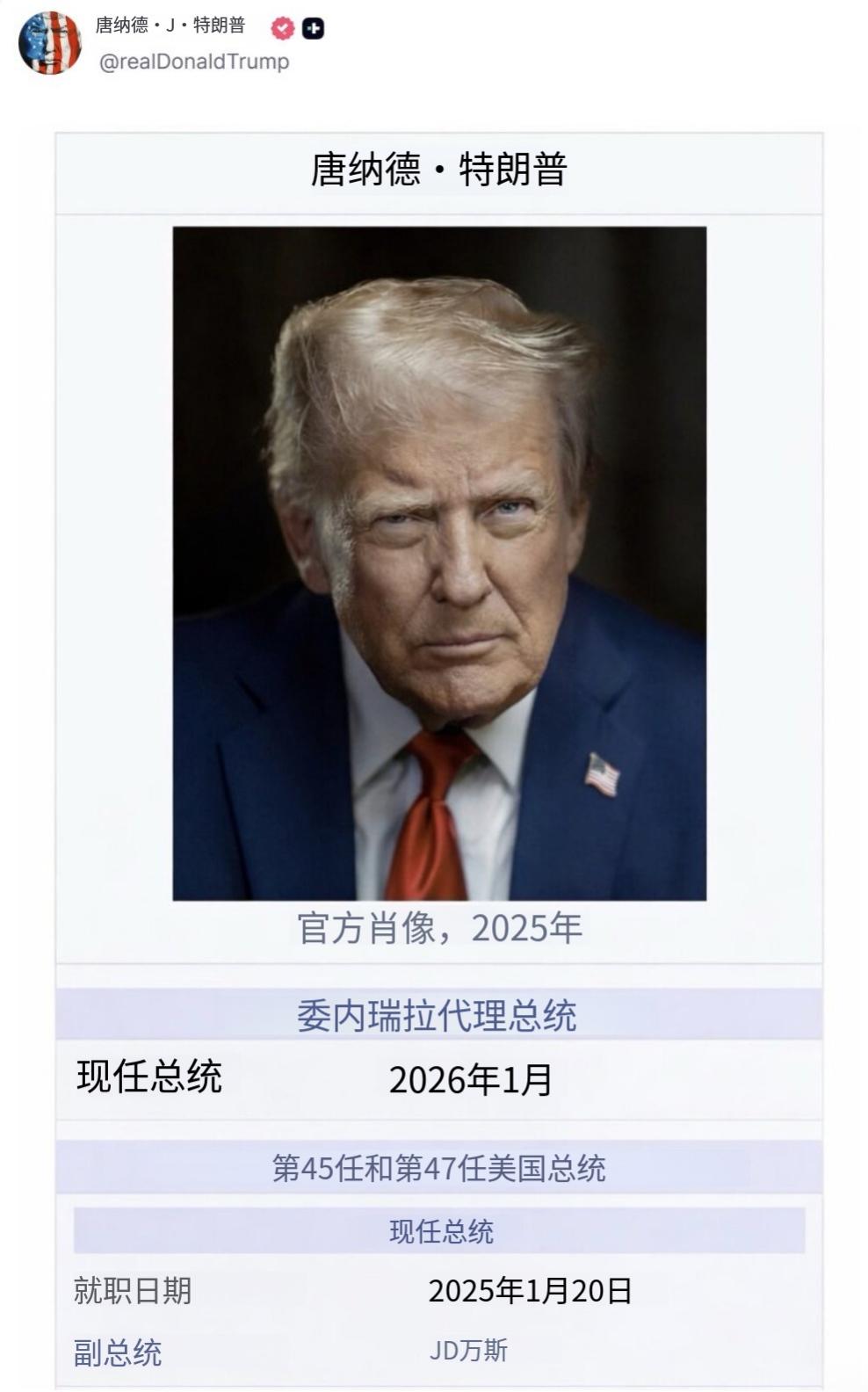 脸都不要了,老特发帖,直接就说自己是“委内瑞拉代总统”! 不得不说,老特总是能给我们出点新花样。 不过,格局还是小了,一个头衔怎么够呢,再给老特整几个。 美利坚合众国总统,特朗普集团至高无上的君主,纽约市第五大道领主,佛罗里达州马拉戈庄园大公,苏格兰阿伯丁郡公爵,怀俄明州牧场大公,真相的终极仲裁者与假新闻征服者,委内瑞拉的征服者,格陵兰岛的无冕之王。
