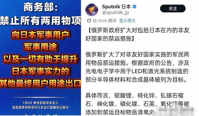 俄罗斯加入对日“斩首”! 日前,俄罗斯方面宣布加入军民两用物资禁运日本行列,这是在中国对日本实施“工业斩首”之后,俄罗斯又补了一刀。 这波操作下来,明眼人都能看出来,日本这是把中俄都得罪透了,才招来这么一顿连环拳。毕竟之前日本的一系列操作,早就把“作死”两个字写在了脸上。 2026年1月5日,日本首相高市早苗还在新年记者会上放话,要推进修订安保三文件,一边喊着要和中国对话,一边却频频发表涉台错误言论,甚至抱着安倍晋三的遗像参拜神社,明摆着就是要在敏感问题上踩红线。 更别说之前跟着美国搞事情,把俄罗斯列为“不友好国家”,冻结俄央行资产、叫停能源合作,还在俄边境附近搞联合军演,推进防务开支扩张,2026年度的防务预算都创了历史新高。这种“政治上挑衅、经济上还想占便宜”的双面做派,没被收拾才叫奇怪。 2026年1月6日,中国商务部直接甩出了2026年第1号公告,宣布对日本实施军民两用物项出口管制,当天就生效,一点缓冲期都没给。 这边中方的禁令刚落地没几天,俄罗斯就在2026年1月9日跟上了节奏,宣布扩大对“不友好国家”的禁运清单,专门把光电子领域的半导体材料和合成晶体列了进去,日本妥妥的是首当其冲。 俄罗斯这次禁运的铌酸锂、砷化镓、碲化锌这些材料,看着名字有点专业,实则都是红外探测、激光制导、高速光通信这些军事技术的核心原料。中俄这两下配合得相当默契,中方卡住的是稀土、稀有金属这些上游原材料,俄方瞄准的是中游功能材料,两者一叠加,差不多把现代武器系统从感知、制导到动力、通信的全链条都给覆盖了。 日本之所以这么慌,核心就是吃了过度依赖的亏。全球90%的稀土加工产能都在中国,而日本军工体系对稀土的依存度超过90%,尤其是制造高精尖武器必不可少的重稀土,比如镝和铽,对华依赖度更是达到100%。 没有这些东西,日本的导弹导引头造不出来,战斗机机身和导弹壳体的高强度铝合金供应会中断,就连新能源汽车电机和机床主轴都没法正常运转。 而俄罗斯禁运的那些材料,恰恰是日本军工里红外成像导引头、声呐阵列这些关键部件的必需品,俄罗斯还是全球少数能稳定量产钆镓石榴石这种单晶材料的国家之一。 现在日本的处境可以说是进退两难。外务省急着抗议,财务大臣赶紧跑去美国参加G7财长会议,想拉着西方搞“去中国化”的稀土供应链,还宣布要启动6000米深海稀土试采,试图用技术突破缓解压力。 可这些操作短期内根本行不通。中国不仅掌控着稀土开采、冶炼、深加工全链条,2025年还发布了新规,明确含0.1%以上中国稀土或采用中国技术的产品出口都得要许可,还禁止为境外稀土相关产业提供技术支持。 日本就算找到替代矿产,也绕不开中国的技术和规则约束。美国那边自身军工也依赖中国稀土供应链,显然不会为了日本牺牲自己的核心利益,所谓的“稀土联盟”顶多就是个政治表态。 不仅如此,日本的军工生产高度依赖民用企业,三菱、丰田这些巨头的一条生产线,既造汽车又产导弹部件。中方的出口管制一落地,这些企业的日常运营直接受影响,整个产业链都面临停摆风险。高超音速导弹研发、新一代潜艇建造这些重点项目,大概率要因为关键材料断供而延期甚至取消。 之前就有过先例,2021年住友重机械工业株式会社为日本自卫队生产机关枪样枪时,还找中国工厂代工零部件,现在这条路子彻底被堵死了。 中俄这次的操作,看似是各自独立决策,却形成了高度互补的协同效应,传递出的信号再明确不过:日本想靠着挑衅中俄来讨好美国,就得付出相应的代价。这种“外科手术式”的反制,只针对军事用途,不涉及普通民生商品,既合法合规,又精准命中了日本的软肋。这也打破了西方长期主导的单边制裁“规则”,让国际社会看到,非西方阵营也有对等的反制能力。 这事儿也给其他跟着美国搞阵营对抗的国家提了个醒,贸易合作讲究的是相互尊重,想靠着“政治挑衅+经济白嫖”的套路占便宜,最终只会反噬自己。日本现在要是还不反思纠错,继续跟着美国一条道走到黑,后续的麻烦只会更多。 毕竟中俄的反制措施才刚刚开始,中方已经明确说了,禁令会持续执行,还不排除进一步细化管制 措施。日本要是还看不清形势,继续硬扛下去,最后只会把自己的工业根基彻底葬送掉。