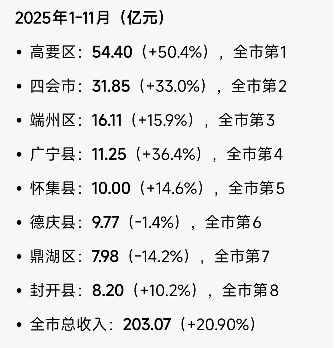 很多人都说现在经济不好大环境不好,但是看肇庆2025年前11月的财政收入,大幅增长,这又何解?只能说明只是部分行业不好,但是经济总体还是向上的,地产垮了会有很多新的行业代替。另外高要真的是个猛兽,增长百分之50,真的太厉害了,四会、广宁也很强。