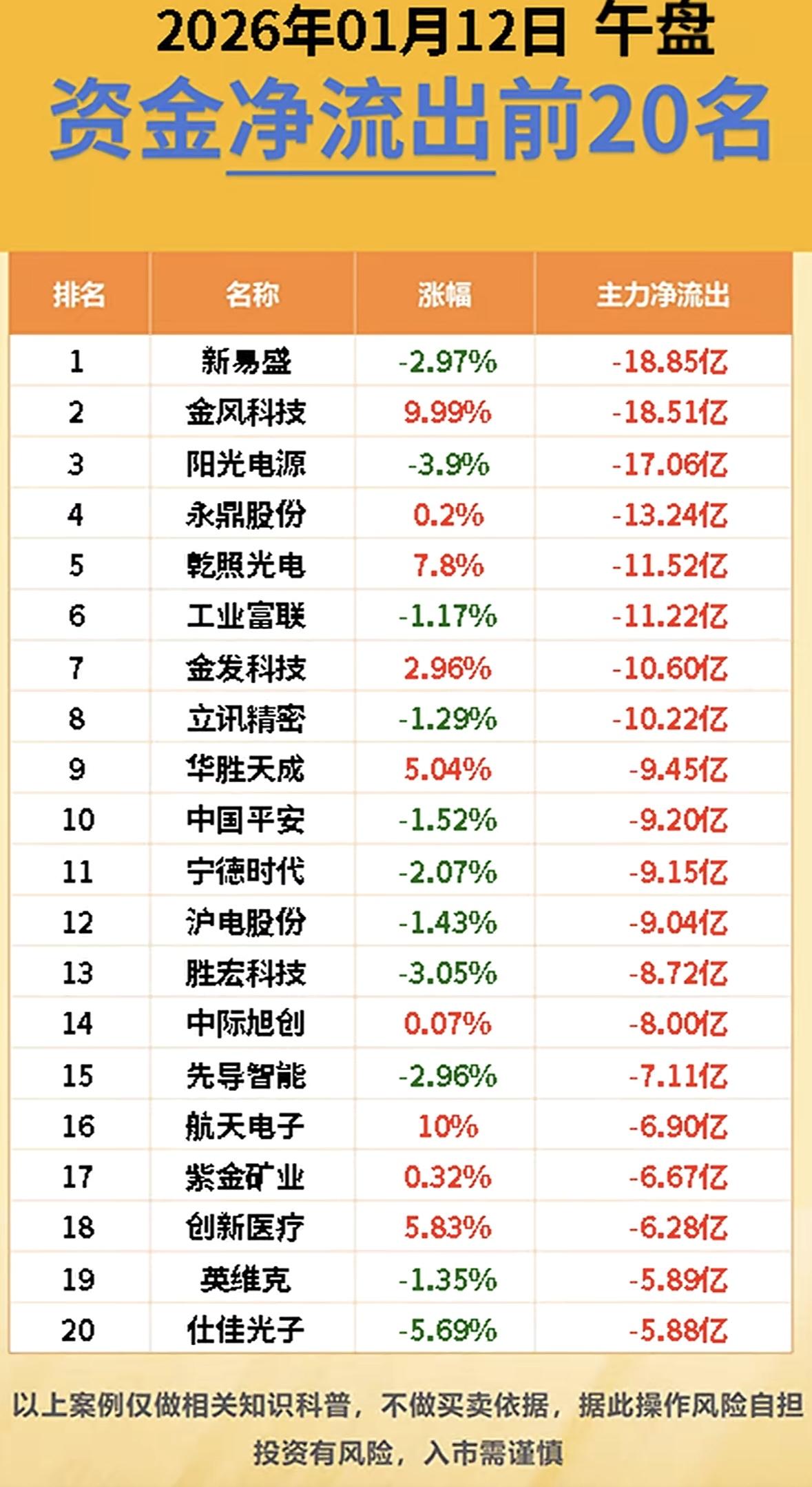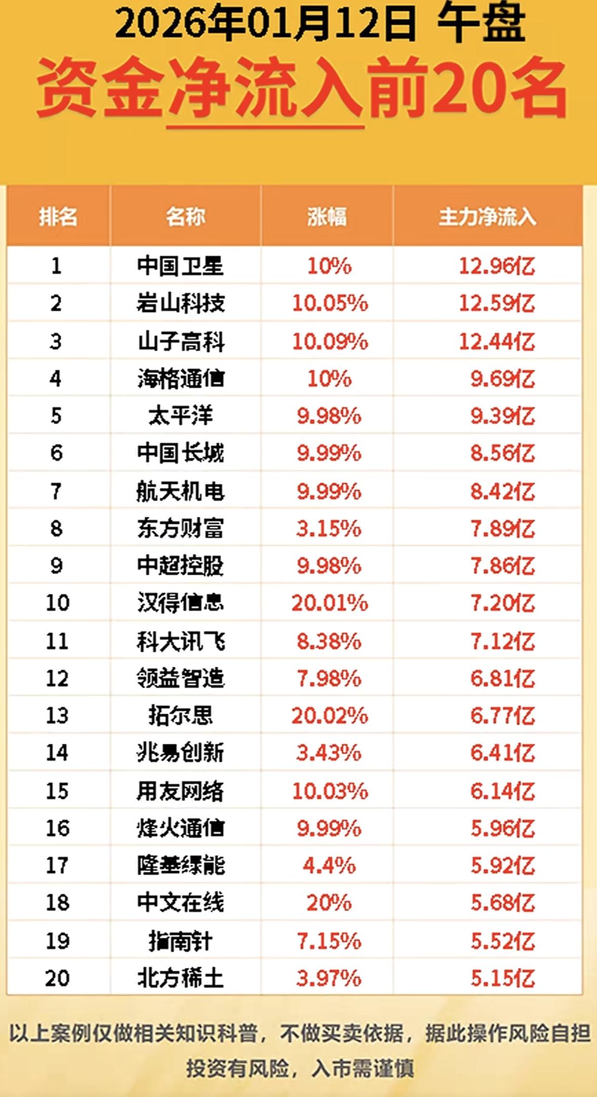 2026年01月12日午盘资金净流入前20名,快来看看哪些股票涨得最猛! 科技股领涨,卫星通信与AI概念吸金强劲,多股主力资金大幅流入,市场热度攀升。 科技股领涨,主力资金抢筹卫星、通信、AI等板块,多股涨停,市场热度攀升。投资需谨慎。