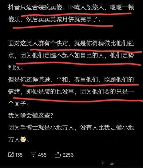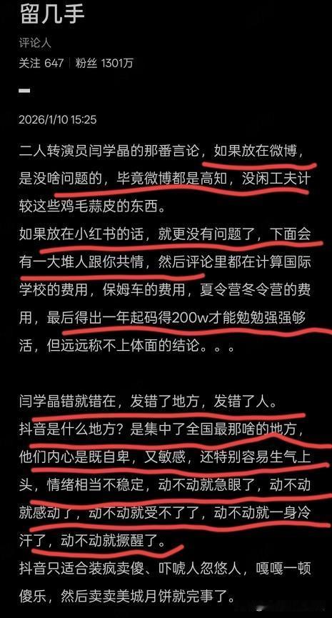 留几手不愧是第一代互联网大网红,对各平台的受众群研究🉐透透的… 他说闫学晶就是没研究明白这些东西,才会在事业上栽如此大方向跟头。 抖那是什么地方?看顶级🔝网红董宇辉就知道了。 我个人觉得,董总是除了留几手外,第二个研究🫘这个平台最透彻的。 在抖,你得表现的稍微比粉丝强点,还得低调谦逊,还得会装疯卖傻。 卖货时既不喊粉丝宝宝,也不喊家人们,而是照顾他们的情绪,喊丈母娘。 所以人家做TOP网红这么多年,依然长盛不衰。 闫学晶如果还有机会直播,建议去董宇辉公司多取取经。