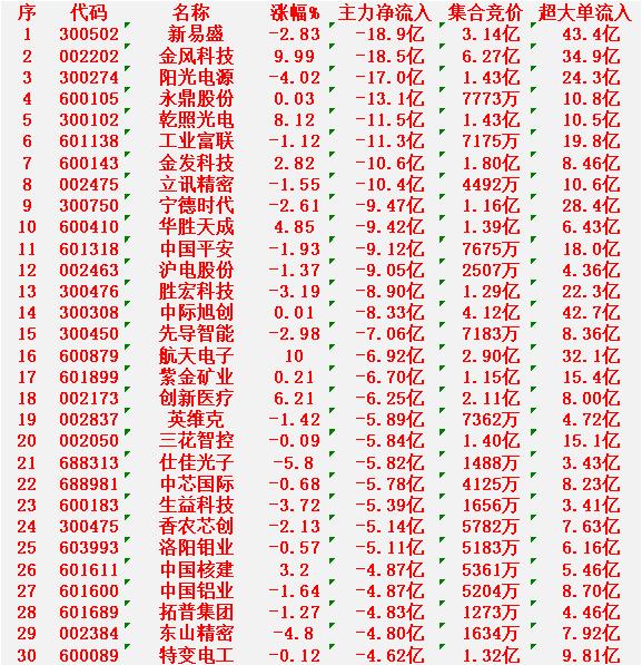 1月12日上午盘,主力趁低位,大幅买入的30名单: 中国卫星:涨幅 10.00%,资金净流入 12.9亿元; 岩山科技:涨幅 10.05%,资金净流入 12.5亿元; 山子高科:涨幅 9.87%,资金净流入 10.6亿元; 海格通信:涨幅 10.00%,资金净流入 9.66亿元; 太平洋:涨幅 9.98%,资金净流入 9.17亿元。 1月12日中午收盘,主力资金“大幅卖出”的30名单: 新易盛:跌幅 2.83%,资金净流出 18.9亿元; 金风科技:涨幅 9.99%(涨停),资金净流出 18.5亿元; 阳光电源:跌幅 4.02%,资金净流出 17.0亿元; 永鼎股份:微涨 0.03%,资金净流出 13.1亿元; 乾照光电:涨幅 8.12%,资金净流出 11.5亿元。