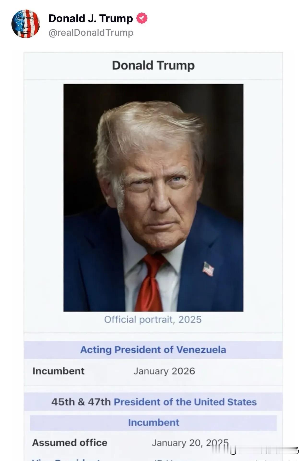 特朗普自己发了一张维基百科的个人简介,除了美国总统,他从2026年1月就任委内瑞拉“临代理总统”[白眼] 但是维基百科的特朗普主页,其实并没有这一项… 这操作真是让人看呆了!没人想到,2026年刚开头,特朗普就用这么离谱的方式抢占热搜。 他在“真实社交”平台晒出的那张截图,词条排版做得有模有样,可稍微懂点常识的人都知道,维基百科的编辑规则有多严格,别说自封外国总统,就算是小细节的修改都要提交可靠来源。 更讽刺的是,就在他发图的前一天,美国刚对委内瑞拉发动完军事行动,强行控制了马杜罗总统夫妇并带回美国,委内瑞拉最高法院已经任命副总统罗德里格斯担任代理总统,根本没特朗普什么事。 这种自导自演的戏码,放在特朗普身上却一点不意外。《华盛顿邮报》统计过,他之前的总统任期内就有超过3万条虚假或误导性言论,平均每天21条,撒谎几乎成了他的标志性操作。 这次的虚假头衔,更像是他单边主义政策的“宣传配套”——1月3日军事入侵后,他9日就签署行政令,把委内瑞拉存在美国的石油收入划归自己“保管”,还召集20多家油企高管开会,要求他们投资1000亿美元到委内瑞拉油田,结果没一家企业敢公开响应。 得不到企业支持,就自己给自己封个“临代理总统”,无非是想给这场非法入侵披上“合法管理”的外衣。 背后的算盘其实很清楚。委内瑞拉的石油储量全球第一,特朗普政府早就盯上这块肥肉。他一边让美军控制加拉加斯的关键设施,一边试图通过自封头衔绕开国际法约束,直接主导委内瑞拉的资源分配。 可国际社会不买账,委内瑞拉代理总统罗德里格斯直接在国家电视台表态,称马杜罗才是合法总统,委方绝不做任何国家的殖民地。 就连美国的盟友都悄悄划清界限,欧盟明确表示不承认美方的军事干预,拉美多国更是联合谴责美国违反《联合国宪章》。 更值得深思的是,这已经不是特朗普第一次用虚假信息配合政治动作了。2025年重返白宫后,他先是退出了66个国际组织,理由是“不符合美国利益”,接着推行“对等关税”搅乱全球贸易,现在又想用自封的“总统头衔”合理化军事入侵。 中国国际问题研究院研究员杨希雨说得透彻,美国这么做就是要推翻多边规则,用“美国说了算”的双边安排取代现行国际秩序。 可现实是,他要求油企投资的呼吁没人响应,想让委内瑞拉代总统访美被直接否认,就连自己炮制的维基百科截图,也被网友扒出来是P图,全程像一场独角戏。 网友的反应更是一针见血。有人截图维基百科真实页面对比,调侃“特朗普可能忘了维基百科不是自己家的社交平台”;有人翻出他2025年解雇美联储理事库克的旧事, 当时他也是发社交平台宣布解雇,结果库克直接无视,继续履职,如今自封外国总统,大概率也是同样的结局。 还有人点出关键:“他连美国国内的法律都懒得遵守,还想着管另一个主权国家?” 这场闹剧的本质,是霸权主义的赤裸暴露。一个国家凭借军事力量入侵他国,扣押他国元首,还试图通过虚假宣传给自己的掠夺行为正名,这种操作已经突破了国际关系的底线。 特朗普或许以为,给自己加个“临代理总统”的头衔,就能让非法占领变得名正言顺,却忘了国际社会的眼睛是雪亮的,国际法的尊严也不是一张P图就能践踏的。 虚假的头衔终会被戳穿,霸权的行径终将遭到反噬。特朗普的这场自导自演,不仅没能掩盖军事入侵的非法本质,反而让更多人看清了单边主义的危险性。 当一个国家可以无视主权平等、随意动用武力、甚至靠撒谎混淆视听时,整个世界的和平稳定都将面临威胁。各位读者你们怎么看?欢迎在评论区讨论。