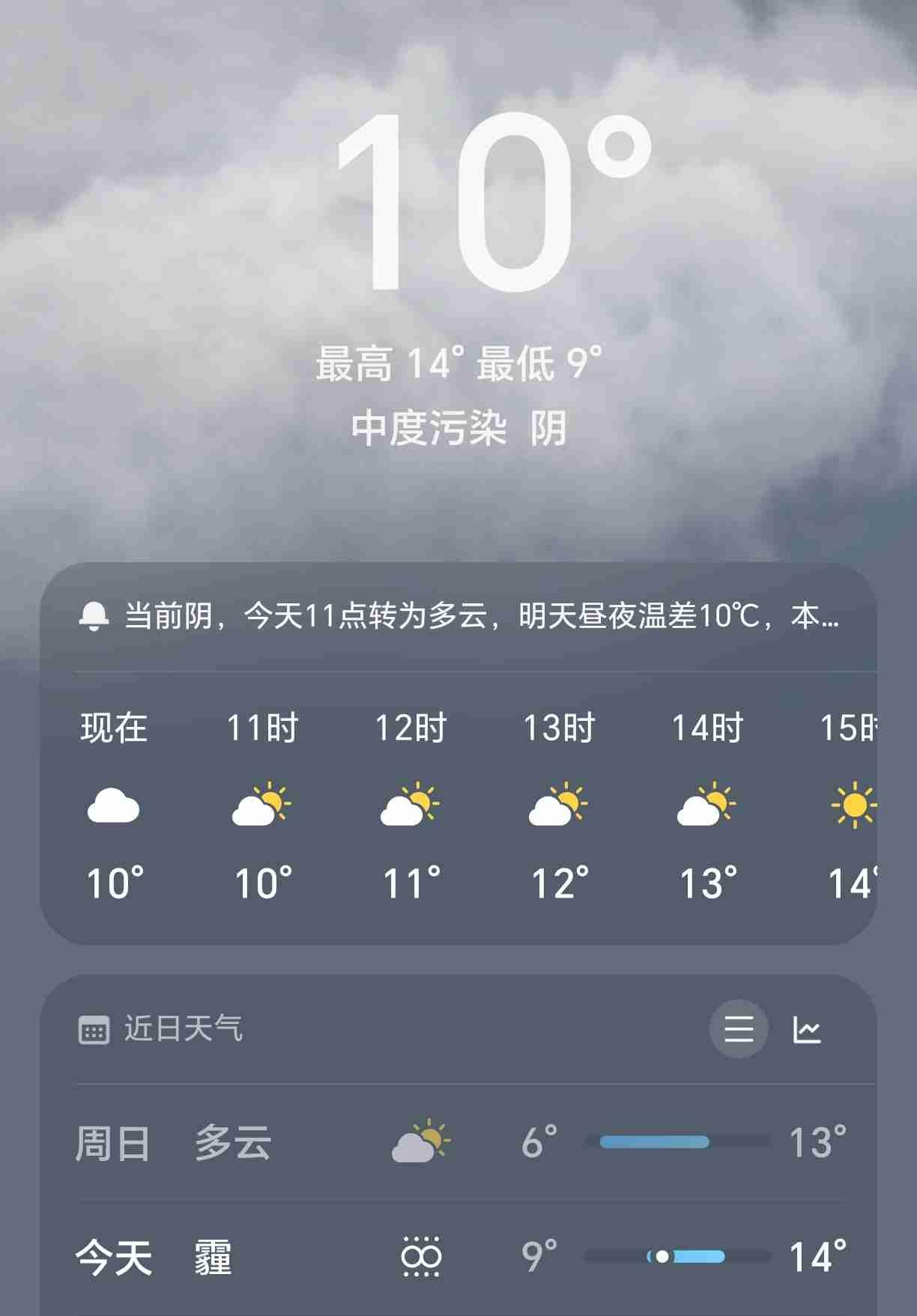 今天有雾霾,是中度污染天气,出门最好戴一个口罩,最低温度9度,最高温度14度,比