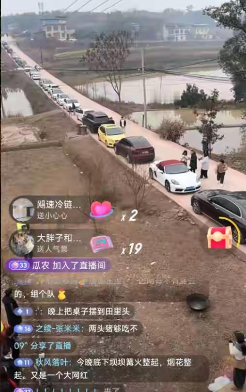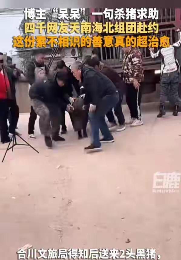 重庆合川的呆呆妹因为家里要杀年猪,担心年迈的父亲按不动猪,就在社交媒体上发帖求助,请两个网友来帮忙,到时候请吃刨汤饭,同时,她还幻想希望家门口到时候停满车,要比结婚场面还多,让她在村里扬眉吐气一回。 呆呆妹原本想着只会来一两桌人帮忙,哪曾想第二天自己一觉醒来惊呆了,村子里外来的车队已经排了长龙,还陆陆续续不断有车子进来,呆呆一下愣住了,像个闯了大祸的孩子,想不到网友们这么热衷吃刨猪汤。她只能如实告诉爸爸两头猪不够吃,然后和村委会报备。 合川文旅知道这个事情后,也赶到现场教导呆呆怎么维持秩序开展活动,带领呆呆拍摄旅游宣传片,更是免费赠送了两头大肥猪,把呆呆家的刨猪汤饭办成了大型乡村宴,各地陌生人围坐共享,尽显邻里温情。 同时合川文旅还不忘本职工作,给每个网友都送了钓鱼城景区的门票,这下合川的gdp真要因为两头猪拉起来了,不得不说,合川区把这波流量牢牢的抓住了。(图片来源于网络侵删)