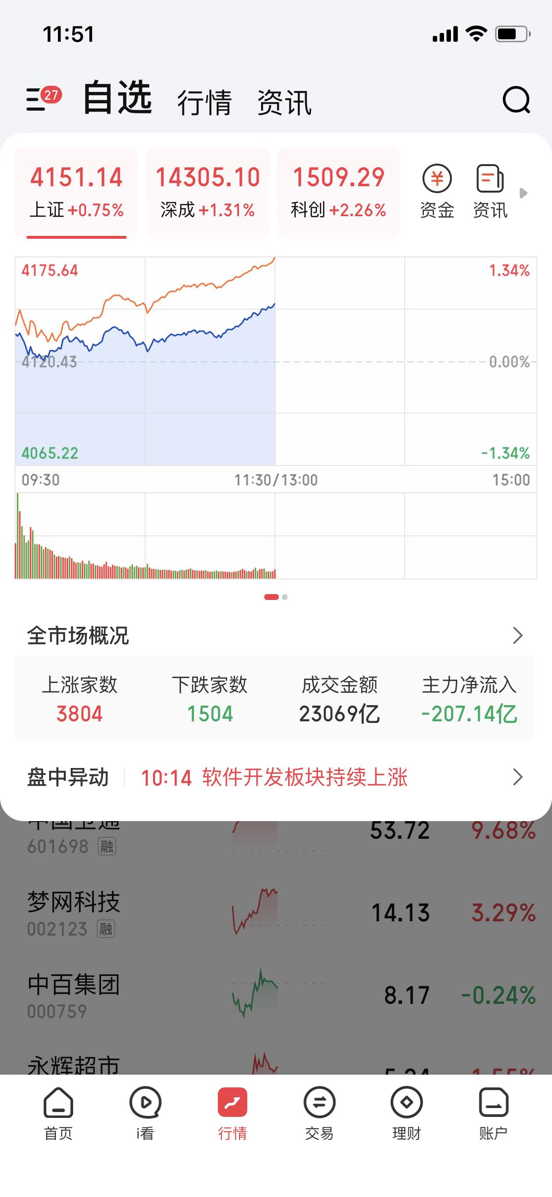 1月12日午盘总结,今天上午成交量23000多亿,3800上涨,商业航天和AL应用端上涨最好,现在的关键性问题商业航天已经压不住了,龙头航发照这样下去收盘后肯定要被关进小黑屋,商业航天板块也会因此退潮,我在卫通涨停的时候买出,也是因为触发严重异动,后面有回调甚至下午一开盘就会有资金出逃,就是咱低吸的好机会,不然就是等监管结束,我更倾向下午资金出逃,股价下跌完美卡异动,顺带说一句12号上午的收益是我买股票这么长时间回本最多的一天,近1W,下午看商业航天回调吧