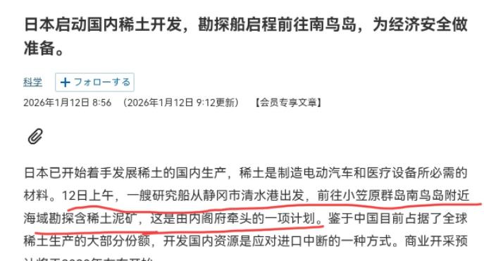 日本态度已明,不会指望中国,日本国内有动作了!1月12日,根据日经新闻报道,就在高市早苗公开表示中国的行为不可接受,管制行为只针对日本之后,日本国内已经有动作了。日媒称,12日上午,一艘日本研究船从静冈市清水港出发,前往小笠原群岛南鸟岛附近海域勘探含稀土泥矿。 所有人都能看出来,日本这次勘探行动针对性极强。高市早苗的表态刚落地,勘探船就紧急出发,两者之间的关联清晰可见。 这背后的核心原因,是日本对中国稀土的深度依赖。稀土是新能源汽车、军工装备等高端制造业的核心材料,尤其是镝、铽这类重稀土,更是制造高精度传感器、耐高温磁体的关键。 日本的产业体系根本离不开这些资源。2025年7月的数据显示,日本当月自中国进口的稀土金属量达到640.27公吨,占同期总进口量的67%,这一比例同比还提升了73.29%。从整体来看,日本当前稀土进口总量的60%-63%都来自中国,而镝、铽等重稀土的依赖度更是超过80%,部分品类甚至接近100%。 中方今年1月6日出台的管制措施,直接击中了日本的痛点。这次管制明确禁止所有两用物项对日本军事用户、军事用途出口,其中就包括关键稀土。日本大和综合研究所的分析已经给出结论,如果中国对日本的稀土供应长期中断,日本实际GDP可能下降1.3%至3.2%,约合7至18兆日元,就业人数也可能减少90万至216万。 日本汽车工业受影响会更直接。日本汽车工业协会的数据显示,该国车企60%的永磁材料依赖进口,其中超80%来自中国。2025年6月,铃木汽车位于静冈县的工厂就曾因中国含稀土零部件到货延迟,直接停工两周。 高市早苗口中的“不可接受”,本质上是对这种依赖困境的焦虑。日本早就想摆脱对中国稀土的依赖,从2010年开始就将“稀土自主”列为国家战略,这十三年来投入了百亿日元,尝试过多种办法。 日本曾大力推进海外找矿。他们投资了澳大利亚莱纳斯矿,还和印度合作建矿。但实际效果并不理想,印度2024年出口日本的稀土中,有1000多吨其实是中国货转口,2025年6月印度还突然终止了供应协议。澳大利亚的矿山则以轻稀土为主,重稀土产量极少,且成本比中国同类产品高20%-30%。 技术替代的尝试也没成功,2025年7月,日本企业宣布研发出无重稀土磁体,预计2026年4月量产。但这款磁体的耐热性、稳定性还没经过市场验证,目前没有任何车企明确表示要采购,短期内根本无法规模化应用。 正是这些尝试接连碰壁,南鸟岛的深海稀土才被日本当成了“救命稻草”。日本海洋研究开发机构公开的数据显示,南鸟岛周边海域的稀土储量超过1600万吨,其中镝储量足够全球使用730年,钇储量足够使用780年。 但理想和现实之间差距极大。这次出发的研究船“地球号”,要在5500米深的海底作业。这个深度的水压相当于海平面的550倍,普通合金结构会像易拉罐一样被压扁,低温和黑暗还会让机械控制、通信链路面临极限挑战。 日本此前只在2500米水深做过小规模技术验证,从2500米到5500米,难度呈指数级增长。本次试采计划持续到2月14日,总共只能采集35吨海底泥浆。按照每吨泥浆可提取约2公斤稀土的计算方式,这次试采仅能获得约70公斤稀土,连300辆新能源汽车的电机需求都满足不了。 就算技术上能突破,成本和环保问题也绕不开。仅本次试采的管道及相关设备采购费用就高达120亿日元,约合8300万美元。后续要实现商业化开采,还需要重建完整的稀土产业链,这一过程可能需要数百亿美元的投资。 更关键的是,稀土产业的核心优势不在资源本身,而在精炼环节。全球约92%的稀土精炼产能都在中国,就算日本能从海底开采出稀土泥浆,也很难绕开中国的技术。澳大利亚莱纳斯公司的核心萃取专利,最早就源自中国赣州稀土研究所,没有中国的冶炼技术,很多国家的稀土矿本质上就是“石头”,提纯纯度不达标,根本用在高端制造上。 日本这次急着派船勘探,更多是一种战略姿态。在对华依赖加剧、外部联盟尚未成型的背景下,日方想通过这种方式向国内外展示“主动寻找出路”的决心。高市早苗政府还计划和美国合作,将深海稀土开发纳入美日合作框架,试图借助外部力量降低风险。 但战略姿态终究不能替代产业现实。中国的稀土优势是从开采、冶炼到高端材料的全链条优势,这种优势建立在数十年的技术积累和产业沉淀上,不是靠短期的深海勘探就能撼动的。 中方的管制措施始终坚持精准施策,商务部已经明确说明,民用稀土贸易不受影响。这一态度既捍卫了国家安全,也维护了全球产业链的稳定。日本真正该做的,是正视自身产业的依赖现状,停止炒作对抗情绪。动辄拿“不可接受”表态施压,不如理性协商解决供应链问题。