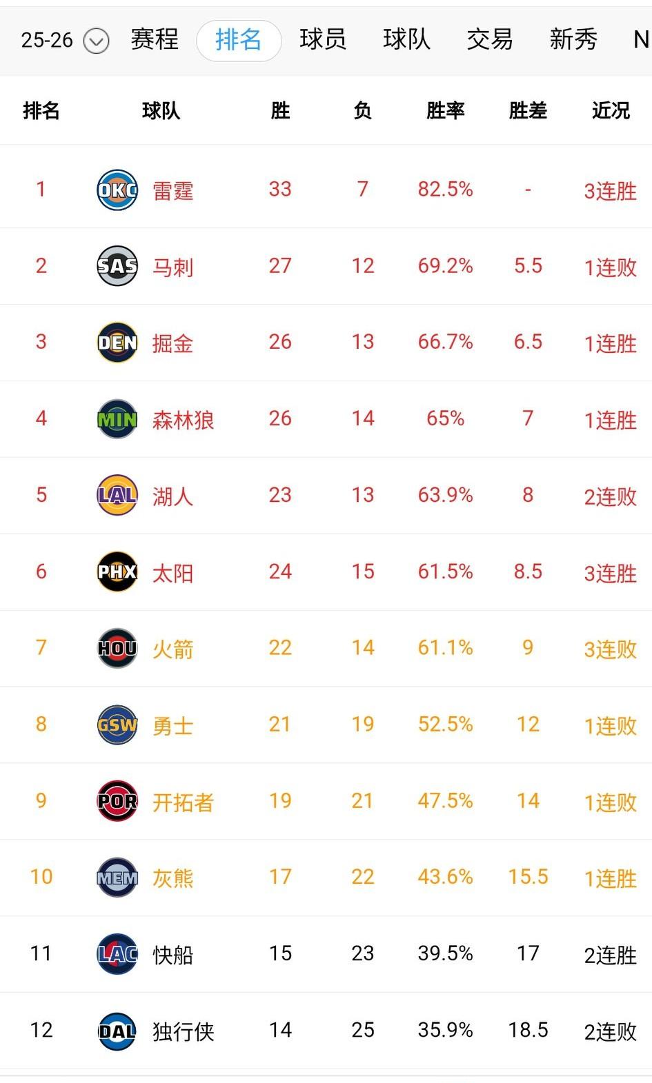 西部最新排名,谁都没想到曾经高居第二的火箭已跌入附加赛区,太阳赢球反超火箭跻身附加赛区。 杜兰特怒摔水瓶后,火箭还是没变化,最近遭遇三连败,申京复出依然无力回天。 湖人似乎好不了多少,幸好今天没比赛,万一输球,它的排名还得掉。 马刺憾负森林狼,排名未受影响稳居西部第二,森林狼拉近差距。 勇士没抓住主场机会,连胜终结。