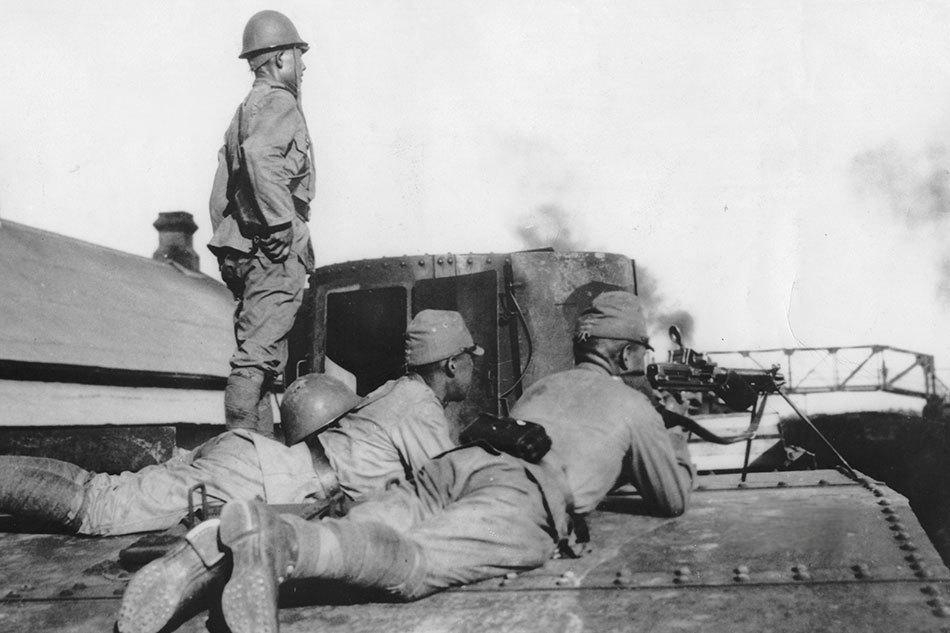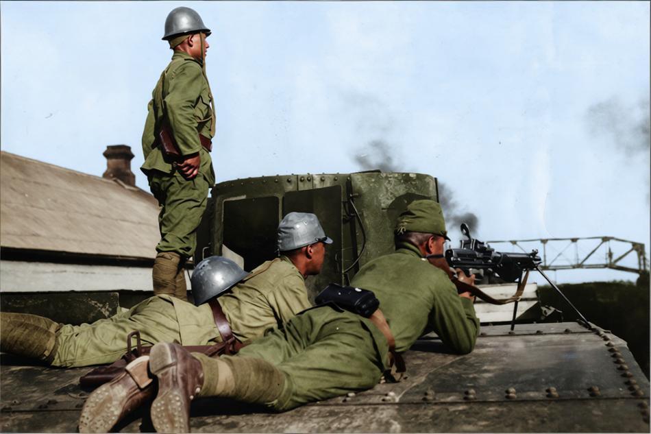 1937年7月,华北战场,日军士兵趴在坦克车体上操作机枪,一人站立警戒,多人卧姿