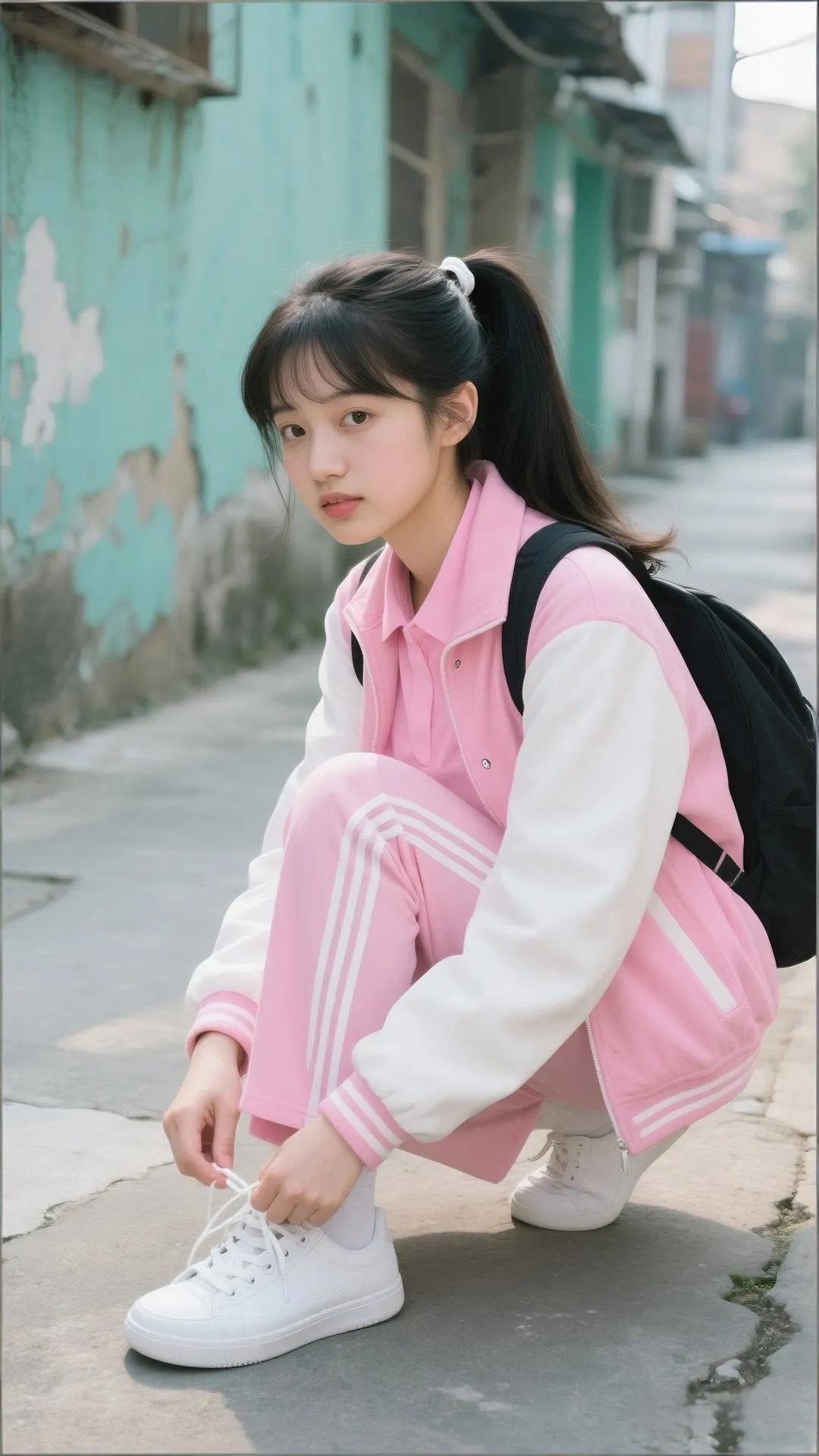 秋日森林中的少女,粉嫩穿搭,比出V字手势,元气满满!🍂💕