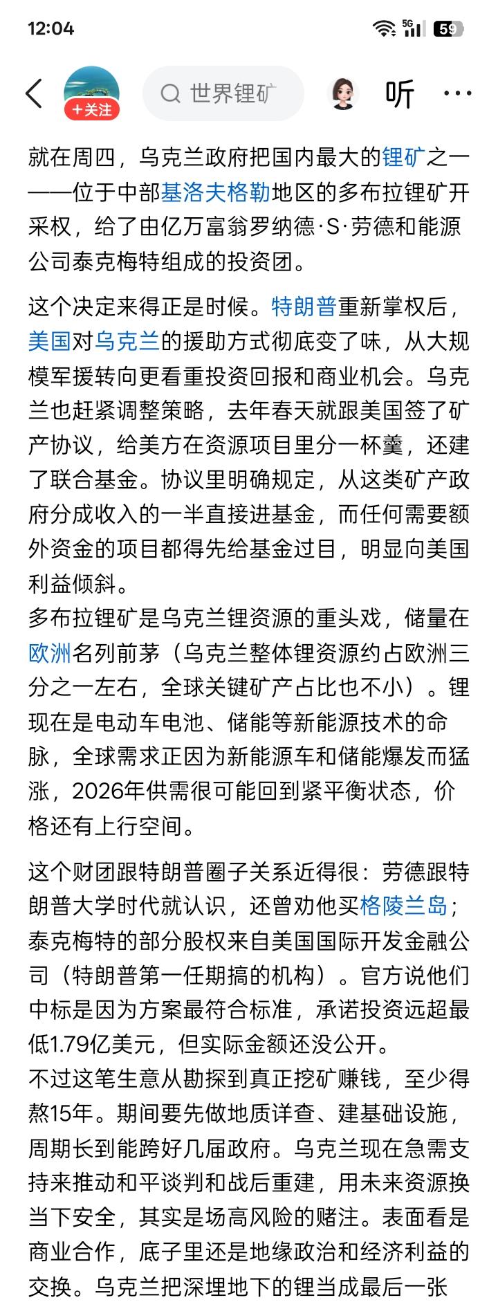 开始割肉了? 据有消息说,乌克兰在上周已经将囯内最大的锂矿、也好像就是一种稀土矿的开采权,给了美国富翁商人罗纳德·S·劳德,以及美国的一个能源公司泰克梅特,他们共同组成一个投资集团。 乌克兰的这个锂矿位于乌克兰中部的基洛夫格勒地区的多布拉,据说锂矿石储量可能是欧洲最多的地方,占欧洲全部锂矿藏的三分之一。 拜登任美国总统的时候,估计考虑的都是在对付俄罗斯的那个大局下,如何支持和援助乌克兰的抵抗战争,没有或较少考虑从乌克兰得到什么利益。特朗普上台任美国总统后,情况可能发生了翻天覆地的变化,现在的美国政府,可能除了考虑对抗俄罗斯的那个大局,主要考虑的问题似乎恰恰相反,就是想方设法,甚至是还可能使用不择手段,从乌克兰得到什么利益,而绝对不是从前主要的支持和援助乌克兰什么。