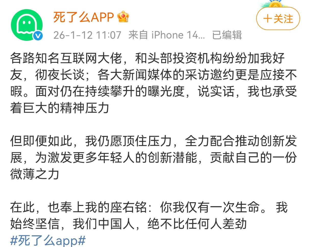 “死了么”APP成苹果商店中国下载量第一,这热度真是惊人。经媒体一聚焦,开发者说承受巨大精神压力。这APP名字就很吸睛,估计很多人是好奇才去下载。下载量上去了,关注度高了,各种声音也会接踵而至。开发者可能没想到会火成这样,面对铺天盖地的讨论和审视,精神压力肯定不小。就像突然被推到聚光灯下,一举一动都被盯着。这也给其他开发者提了个醒,爆火不一定全是好事,得有足够的心理准备应对后续的种种状况。 APP