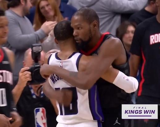 分开已10年!杜兰特、威少赛后紧紧拥抱! 火箭对阵国王,是威少和杜兰特分开后的第19次交手,而威少最终帮助球队赢球,把两人对阵的战绩改写为12胜7负,威少遥遥领先。 这一次稍微可惜的,是威少没有对杜兰特送上身后大帽的惯常礼仪,在奇才、火箭、湖人、快船时期,每一次碰到杜兰特,威少都是情绪亢奋全场飞奔,追着杜兰特抢断封盖,也送出了很多次精彩的大帽杜兰特的画面。 现在两人年纪都上来了,没有那么剑拔弩张,球场上对抗的动作也小了很多,时间抹平了一切,这哥俩同场打球的机会也是越来越少了。