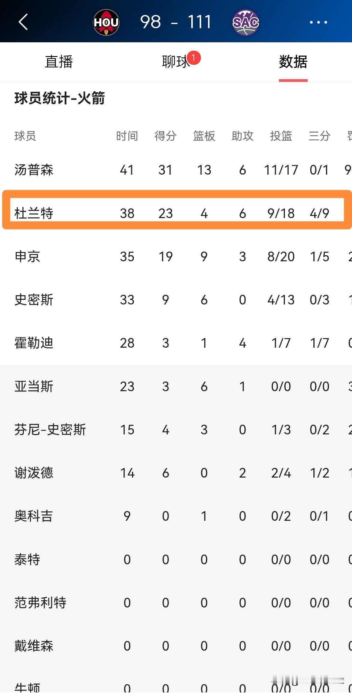 火箭巨星杜兰特还能在火箭效力多久?今天火箭在客场以98:111爆冷不敌国王,惨遭三连败。本场比赛,杜兰特首发出战38分钟,投篮18中9,其中三分球9中4、罚球1中1空砍23分4篮板6助攻,他的场上正负值为-9。 事实证明,以火箭目前的阵容配置来看,杜兰特绝无可能带领球队夺冠,以杜兰特的性格和习惯来看,当杜兰特看不到夺冠的希望时,他就会萌生离队的想法。 大家觉得杜兰特还能在火箭效力多长时间?