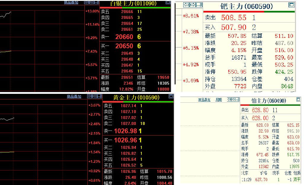 还有几分钟, 国内金融市场 下午的交易就要开始了。 今日上午, 国内贵金属强势运行, 黄金、白银,铂金和钯金大幅飙升。 截止11:30分, 国内黄金期货上涨2.64%; 钯金期货上涨4.15%; 铂金期货上涨5.53%; 白银期货更是上涨12.82%。 对于飙升的贵金属, 期货小褚只能继续仰望天空般观望!