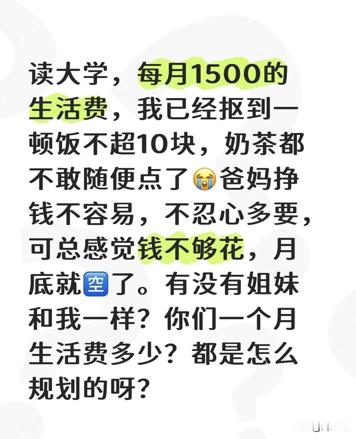 这是一位女大学生的求助,直言读大学,父母每个月就给1500元的生活费,已经抠到一顿饭不超过10块,奶茶都不敢随便点了…. 此话一出,不少网友纷纷表示:“对于一般家庭1500已经很多了,最好先记一下每天到底花在哪儿了。照理说知道爸妈挣钱不容易的孩子不应该啊,真正省吃俭用的一个月500也能活着!” 看完这事,周少想说读大学父母每个月给1500元生活费真不少了,在大学食堂吃饭,基本上是够了。这位女大学生真要知足啊,懂得父母赚钱不易是好事,如果真不够,可以课余时间去做做兼职。再者是要学会合理规划开支,比起抱怨不够花,这才是真正需要提高的地方…#寻美三湘# #长沙新朋友#