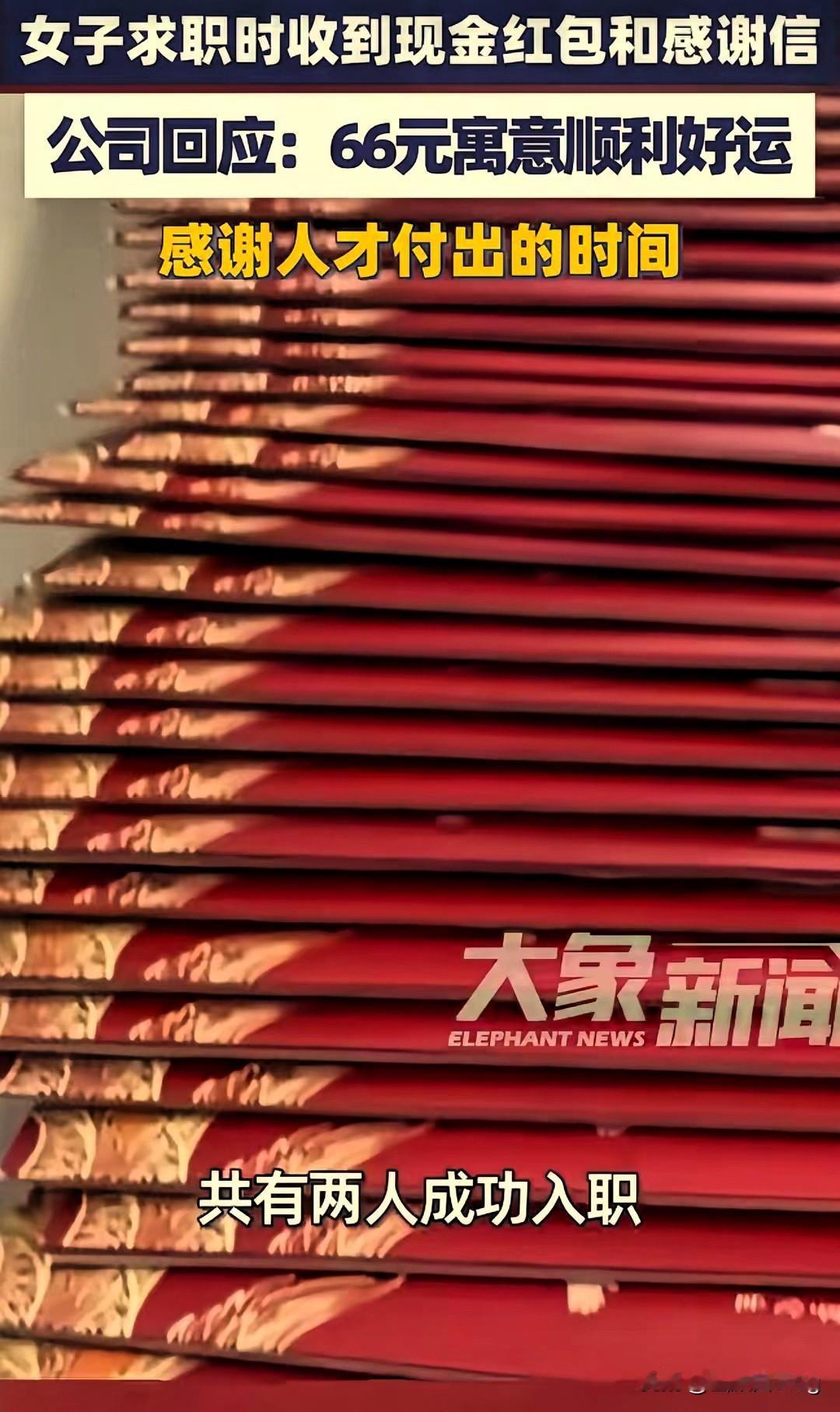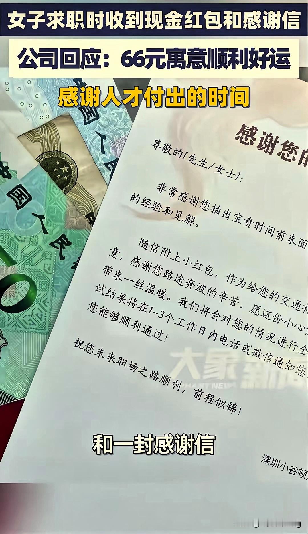 深圳这家公司的面试红包,才懂职场最缺的从不是工资! 面试完居然收到66元红包+感谢信,不管录不录用都有份,这操作直接戳中无数打工人的心巴! 要知道多少人求职时遭过冷遇:面试官玩手机不抬头,被挖苦长相学历,面试后石沉大海。 66块不多,却藏着最珍贵的同理心——承认求职者的路途奔波,尊重每一份付出。 企业的格局从招聘就见分晓,连面试者都善待的公司,怎么会亏待员工? 这种双向尊重的职场氛围,才是留人的关键。 你面试时遇过最暖心的瞬间是什么?